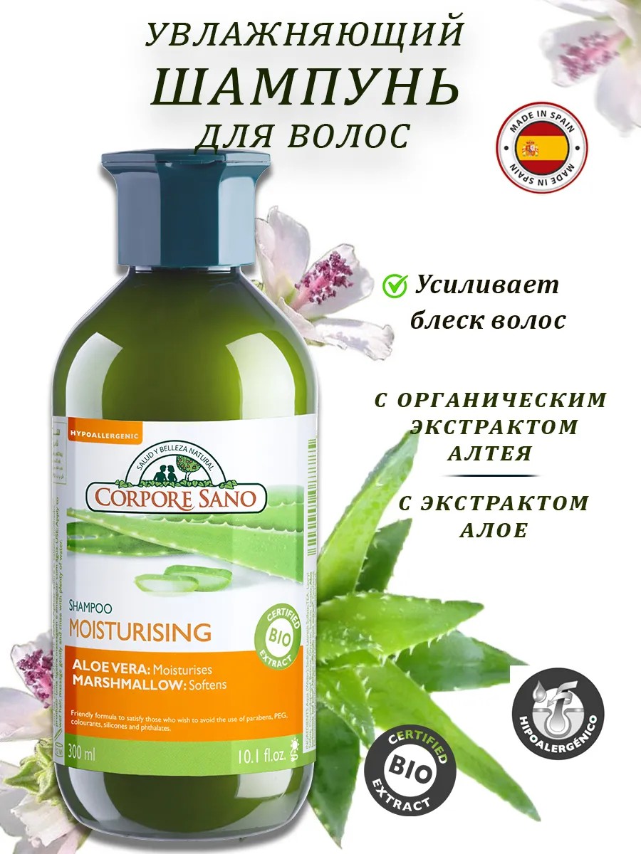 Подарите своим волосам заботу, которую они заслуживают, с увлажняющим шампунем Corpore Sano, в состав которого входят натуральные экстракты алоэ вера и алтея. Этот продукт, произведенный в Испании, создан специально для тех, кто сталкивается с проблемой сухих и тусклых волос. Более 90% ингредиентов шампуня являются натуральными, что делает его идеальным выбором для бережного ухода. Увлажняющий шампунь Corpore Sano эффективно восстанавливает уровень увлажнения, необходимый для здоровья волос. Он подходит для волос, поврежденных термической обработкой, а также для тех, кто испытывает негативное влияние внешней среды, включая солнечные лучи и хлорированные бассейны. Результат применения — мягкие и блестящие локоны, полные жизни и энергии. Благодаря уникальной формуле, шампунь удерживает влагу, запечатывая кутикулу и обеспечивая дополнительный блеск. Обогащенный комплексом витаминов A, B5, H и E, он не только увлажняет, но и защищает волосы от вредного воздействия окружающей среды. Алоэ вера, известное своими смягчающими свойствами, в сочетании с органическим экстрактом алтея, придает волосам шелковистость и ухоженный вид. Шампунь имеет мягкую очищающую основу на растительной основе и не содержит красителей, силиконов, парабенов или ПЭГ. Это делает его отличным выбором для чувствительной кожи головы и для тех, кто предпочитает экологически чистую косметику. Гипоаллергенная формула заботится о ваших волосах, поддерживая их естественный баланс и кондиционируя без утяжеления. Использование увлажняющего шампуня Corpore Sano — это не просто уход, это настоящий ритуал, который поможет вашим волосам выглядеть здоровыми и блестящими. Побалуйте себя и свои волосы качественным продуктом, который вернет им жизненную силу и красоту. Выберите Корпоре Сано и ощутите разницу! Органик шампунь. Био шампунь.