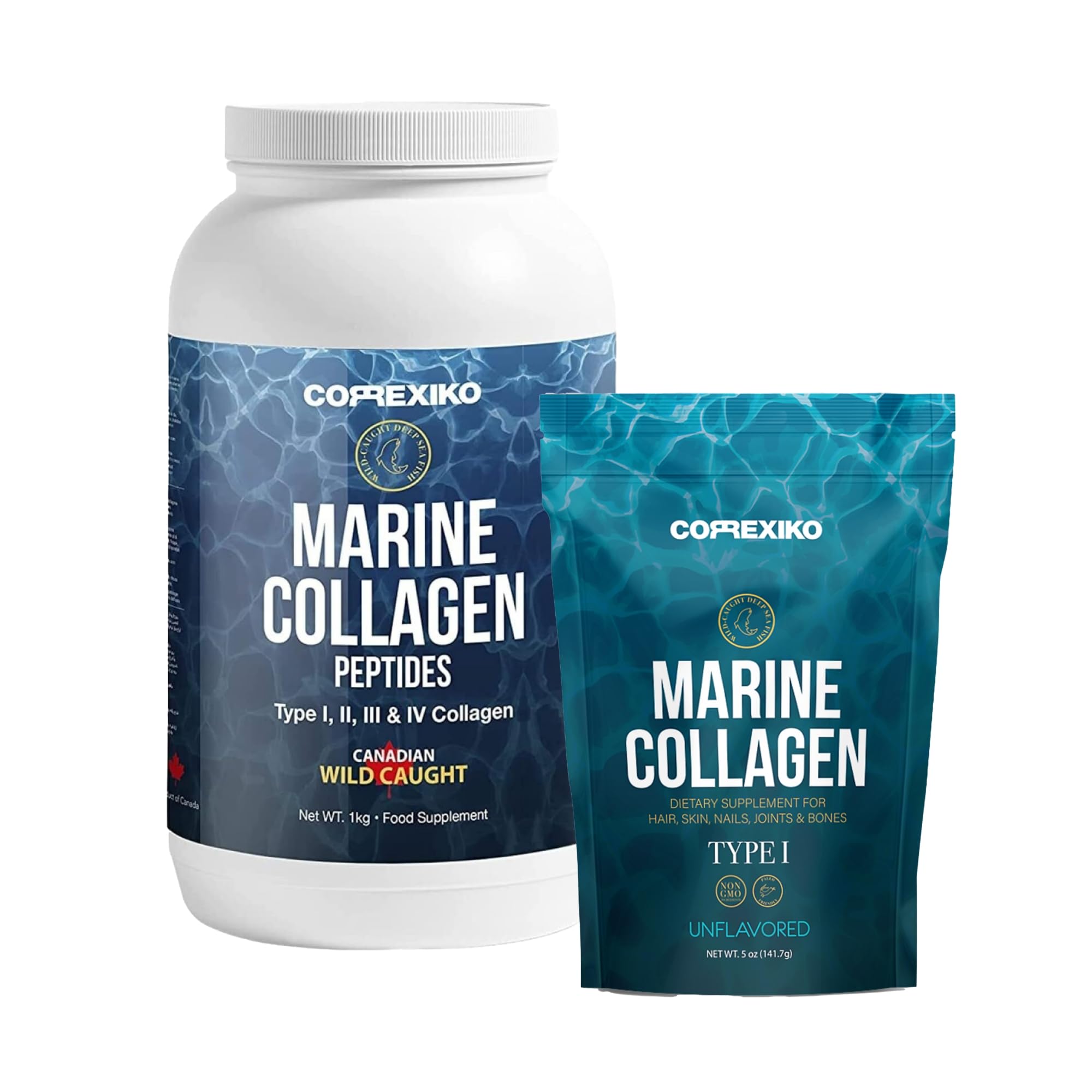 THE RESULTS: Introducing our collagen supplement into your daily routine can have a wide range of health and beauty benefits. With three months of consistent use, you'll notice anti-aging benefits such as a reduction in the appearance of fine lines and wrinkles. Collagen can also improve the quality of your hair and nails, making hair thicker and nails stronger. There are also a number of physical health related benefits such as greater joint mobility and improved gut, heart and bone health. PREMIUM INGREDIENTS: Our Marine Collagen is sourced from wild-caught deep sea fish following the most rigorous regulations and quotas. We use the fish skin, which is naturally rich in collagen, to ensure that our collagen is premium in its quality and effectiveness. It's gut friendly, paleo, keto, kosher, non-GMO and gluten free. You'll also never find fillers, binders, preservatives, hormones, artificial sweeteners or ingredients in our formulations. WHY CHOOSE CORREXIKO'S COLLAGEN: Correxiko is founded by a British medical Doctor with over 30 years of experience researching the benefits of Marine Collagen. All of our collagen supplements are formulated to the highest medical standards with each ingredient carefully chosen for its skin health properties and ability to work in synergy with your body's natural collagen production. WHY TAKE A COLLAGEN SUPPLEMENT: As we age, our levels of collagen start to drop dramatically which can lead to visible impacts to the health and quality of our skin, hair, nails and joints. Whilst topical products such as moisturizers, serums and creams can help to reduce surface level signs of aging such as fine lines and wrinkles, collagen can tackle the problem from the inside out. A GREAT ON-THE-GO BUNDLE: This bundle is a great way to ensure that you can take your collagen with you wherever you need to go. Keep the large 1kg tub at home for everyday use whilst the compact and travel friendly 5oz pouch is great for taking on the go. Whether you want to keep a supply of collagen with you to have at the office or take it with you on your next vacation, this bundle is a great way to make sure you're never without your daily supplement.