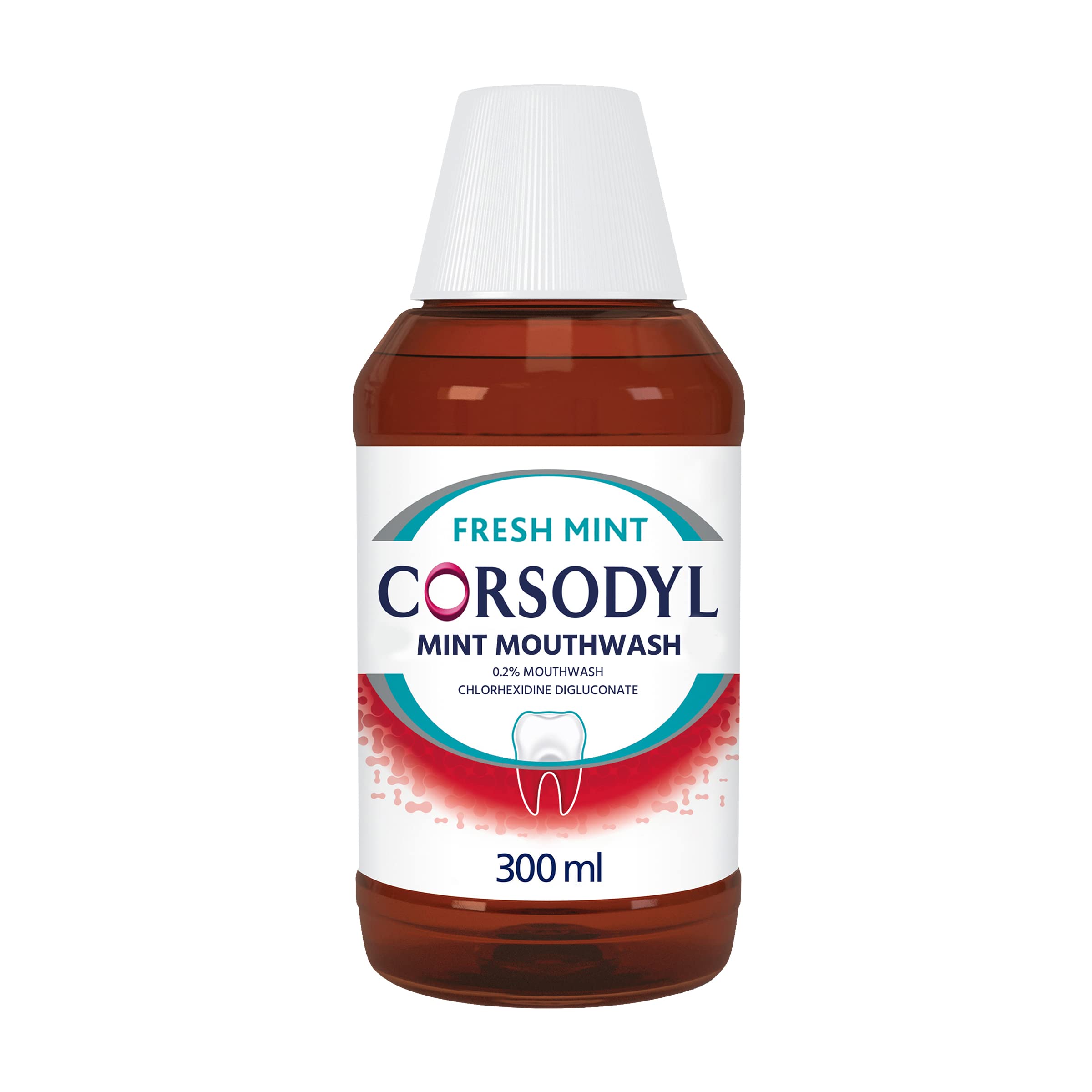 WHAT IS CORSODYL 0.2 MOUTHWASH: Corsodyl 0.2 Gum Disease Bleeding Gum Treatment Antibacterial Mouthwash is an oral medicine. It contains chlorhexidine digluconate for an effective gum disease treatment for adults, where gums may bleed when brushed. WHY CHOOSE CORSODYLWhen left untreated, gum disease is a major cause of tooth loss, so it is important to act fast at the first sign of gingivitis, including bleeding, red, or swollen gums. Thanks to the active agent chlorhexidine digluconate, Corsodyl 0.2 Mouthwash reduces the formation of dental plaque. It kills the leading cause of gum disease in 30 seconds before it gets a chance to develop into irreversible periodontitis, the second stage of gum disease. This antibacterial mouthwash forms a protective layer over teeth and gums for up to 12 hours and maintains good oral health, managing oral thrush and denture sore mouth. It also promotes the healing of gums after dental surgery or treatment. WHAT DOES IT TASTE LIKE: This medicated Corsodyl 0.2 Mouthwash comes in fresh mint flavour. plaque bacteria in laboratory studies when used as directed Corsodyl Original Alcohol Free Mouthwash contains chlorhexidine digluconate. For the treatment of gingivitis. Always read the label. INGREDIENTS Active ingredient: Chlorhexidine Digluconate 0.2 w v, Other ingredients: Ethanol 7 v v, Macrogolglycerol Hydroxystearate, Sorbitol, Peppermint Oil and Water DIRECTIONS How to use Use only if seal on cap is present and intact before opening. Contains alcohol. If swallowed by a child seek medical help. Do not swallow. Do not exceed the stated dose. Toothpastes can stop Corsodyl working. Rinse your mouth thoroughly with water and wait 5 minutes after brushing your teeth before using Corsodyl. You can also use the mouthwash at a different time of day. Use twice a day. Fill the cap to 10 ml line. Rinse mouth thoroughly for 1 minute then spit out. Gum disease: A one month course (600 ml) is recommended. Mouth ulcers oral thrush: Continue to use for 2 days after healing has occurred. Denture sore mouth: Clean soak your dentures in Corsodyl for 15 minutes twice a day. Dental surgery: Rinse as directed by your dentist. If your symptoms persist, see your dentist. SAFETY WARNING Check before you use Do not use: If your have ever had an allergic reaction to chlorhexidine digluconate or any of the other ingredients (see Storage and further information). In children under 12 years unless recommended by a dentist. Anywhere other than in your mouth. Wash thoroughly if you get in your eyes or ears. Immediately after brushing your teeth. See How to use more information. Take special care with Corsodyl Do not bleach fabrics that have been in contact with the mouth. Pregnancy and breast feeding You can use Corsodyl if you are pregnant or breast feeding. Possible side effects Corsodyl can have side effects, but not everybody gets them. Stop using the mouthwash and seek immediate medical help if you get a rash, swelling of the mouth or face or have difficulty breathing. These effects may be symptoms of a severe allergic reaction which is very rare. Stop using the mouthwash and tell your dentist if you get irritation of the mouth, soreness, or swelling of the inside of the cheeks. These effects should go away when treatment is stopped. Other side effects that may occur: Temporary staining of the tongue. This disappears when treatment is stopped. Temporary staining of the teeth. This can normally be removed by brushing. You can avoid staining by not drinking tea, coffee or red wine - especially one hour after use, and by brushing daily with toothpaste. If staining continues it can be removed with a scale polish from your dentist or hygienist. You can clean your dentures with denture cleaner. You may notice a change of taste or burning sensation when you first use the mouthwash. This usually goes away with continued use. If peeling of the skin inside the mouth occurs, dilute Corsodyl with an equal amount of water. If you do get any side effects, even those not mentioned above, tell your doctor, dentist or pharmacist. Keep out of the reach and sight of children. Do not use after the 'EXP' date shown on the pack. MANUFACTURER CONTACT INFORMATION MA Holder: GlaxoSmithKline Consumer Healthcare, Brentford, TW8 9GS, U.K. The manufacturer is: BCM Ltd, Nottingham, NG90 2PR, U.K.MA Holder: GlaxoSmithKline Consumer Healthcare, Brentford, TW8 9GS, U.K. The manufacturer is: BCM Ltd, Nottingham, NG90 2PR, U.K. See moreA short-term intensive treatment to be used for no longer than 2-4 weeks, pour 10ml of Corsodyl Mouthwash, rinse for 1 minute, and then spit it out. Use twice daily. Corsodyl 0.2 Mouthwash contains chlorhexidine digluconate. For the treatment of gingivitis. Always read the label. Promotes good oral hygiene and healing after dental surgery or treatment, can be used as an aid to manage denture sore mouth, oral thrush or recurring mouth ulcers, and stops bleeding, swollen, and inflamed gums. With triple-action efficacy, this Corsodyl mouthwash kills, repels, and lasts . This medicated mouthwash is an effective gingivitis treatment, killing the main cause of gum disease in just 30 seconds . Corsodyl 0.2 Mouthwash is a medicine containing chlorhexidine digluconate for the treatment of early signs of gum disease. This anti-bacterial mouthwash in 300ml comes in fresh mint flavour.