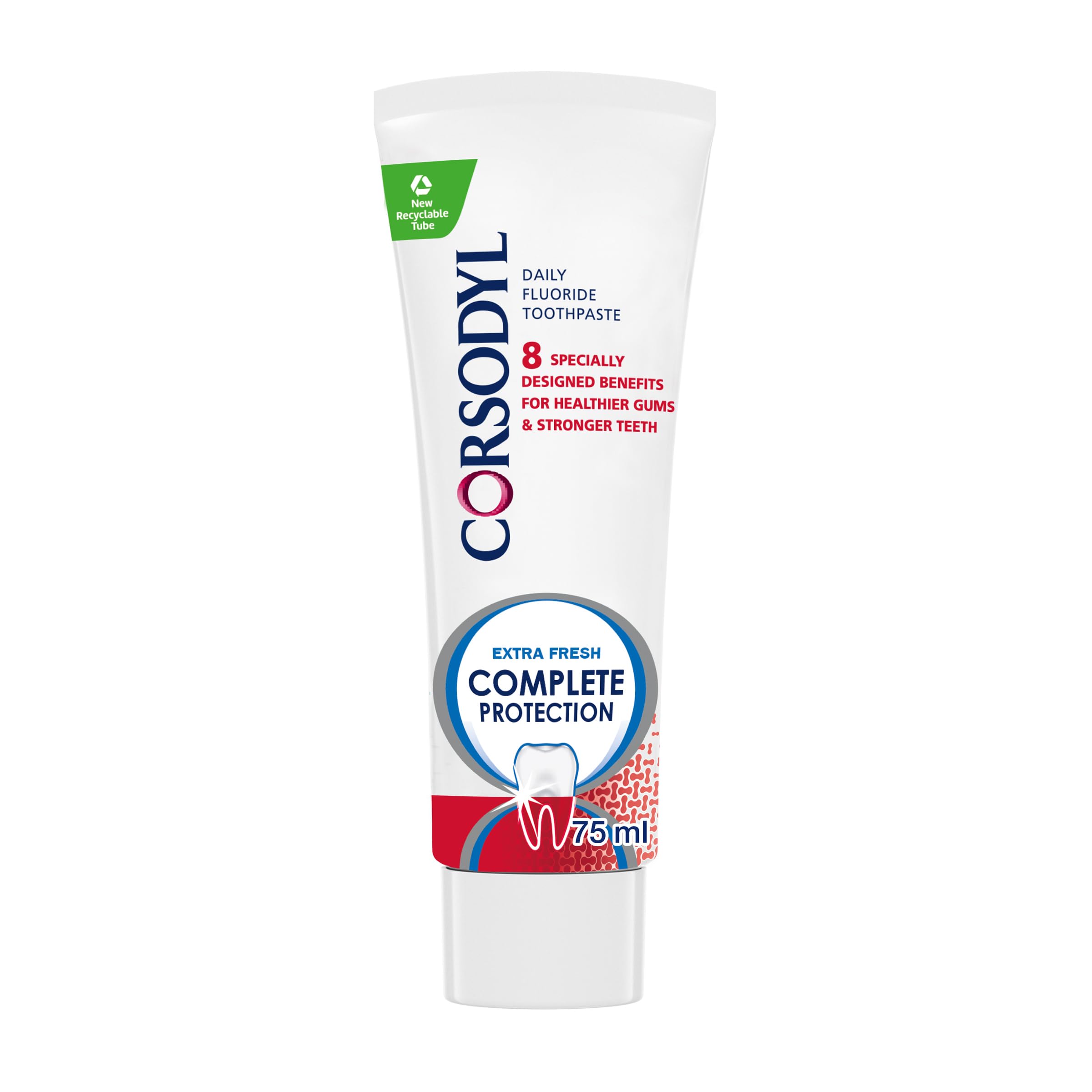 Corsodyl Complete Protection Pack helps maintain healthy gums by targeting the buildup of plaque bacteria that can lead to gum problems. Corsodyl Complete Protection Extra Fresh toothpaste offers 8 benefits for healthy gums and strong teeth: reduces bleeding and inflamed gums, removes plaque bacteria, tightens the gum line, freshens breath, strengthens enamel, deep cleans, and gently whitens. It is 4 times more effective at removing plaque than regular toothpaste (the leading cause of bleeding gums). Corsodyl Complete Protection Extra Fresh mouthwash is specially formulated to target plaque bacteria along the gum line that can cause gum problems when used twice daily in combination with brushing. It contains fluoride and is alcohol-free, so you can use it every day for healthy gums and strong teeth. It has a fresh mint flavor and added zinc for breath freshening protection. Compared to regular toothpaste. To verify the claim, please contactmystory.gb haleon.com INGREDIENTS Sodium Bicarbonate, Aqua, Glycerin, Hydrated Silica, Sodium Lauryl Sulfate, Aroma, Xanthan Gum, Cocamidopropyl Betaine, Sodium Saccharin, Sodium Fluoride, Titanium Dioxide, Steviol Glycosides, Limonene, CI 77491. Contains 0.31 w w sodium fluoride (1400 ppm fluoride). DIRECTIONS Brush twice a day and no more than three times. Minimize swallowing and spitting. SAFETY WARNING Always follow the label. Keep out of reach of children. Not suitable for children under 12 years. Consult a dentist if symptoms persist or if children experience bleeding gums. If irritation occurs, discontinue use. Consult your dentist or doctor as soon as possible if you experience swelling of the mouth or face. See moreRecyclable tube, carton, and cap. Specially designed to physically eliminate the cause of gum problems, targeting the buildup of bacteria along the gum line. It also works to keep the seal between gums and teeth tight, targets bad breath, and strengthens enamel with a mineral accelerator. Helps stop and prevent bleeding gums and is 4 times more effective at removing plaque with twice-daily use compared to regular toothpaste. Corsodyl Extra Fresh Complete Protection Toothpaste is a daily gum health toothpaste with benefits specifically designed for healthy gums and strong teeth.Corsodyl Dentifrice Protection Complète, Soin quotidien des gencives, Extra Frais pour des gencives saines et des dents fortes, 75 mlDESCRIPTION DU PRODUIT DESCRIPTION DU PRODUIT Corsodyl Le pack de protection complet aide à maintenir des gencives saines en ciblant l'accumulation de bactéries de la plaque dentaire qui peuvent conduire à des problèmes de gencives. Le dentifrice Corsodyl Complete Protection Extra Fresh vous offre 8 avantages pour des gencives saines et des dents fortes : réduit les saignements et les gencives enflammées, élimine les bactéries de la plaque, resserre le joint des gencives, rafraîchit l'haleine, renforce l'émail, nettoie en profondeur et blanchit en douceur. Il est 4 fois plus efficace pour enlever la plaque dentaire qu'un dentifrice ordinaire (la principale cause de saignement des gencives). Le bain de bouche Corsodyl Complete Protection Extra Fresh est spécialement formulé pour cibler les bactéries de la plaque dentaire le long de cette ligne gingivale qui peuvent causer des problèmes de gencives, lorsqu'il est utilisé deux fois par jour en combinaison avec le brossage. Il contient du fluorure et est sans alcool, de sorte que vous pouvez l'utiliser tous les jours pour des gencives saines et des dents fortes. Il a une saveur fraîche de menthe et du zinc ajouté pour une protection de l'haleine fraîche. Par rapport à un dentifrice ordinaire. Pour vérifier la réclamation, veuillez contactmystory.gb haleon.com INGRÉDIENTS Sodium Bicarbonate, Aqua, Glycérine, Hydrated Silica, Sodium Lauryl Sulfate, Aroma, Xanthan Gum, Cocamidopropyl Betaine, Sodium Saccharin, Sodium Fluoride, Titanium Dioxide, Steviol Glycosides Limonene, Cl 77491. Contient du fluorure de sodium 0,31 w w (1400 ppm fluorure). MODE D'EMPLOI Brossez deux fois par jour et pas plus de trois fois, minimisez l'ingestion et la crache. AVERTISSEMENT DE SÉCURITÉ Suivez toujours l'étiquette. Tenir hors de portée des enfants. Ne convient pas aux enfants de moins de 12 ans. Consultez un dentiste en cas de symptômes qui persistent ou des enfants souffrant de saignements des gencives. En cas d'irritation, cessez l'utilisation. Consultez votre dentiste ou votre médecin dès que possible, si vous ressentez un gonflement de la bouche ou du visage. Voir plusTube, carton et capuchon recyclables. Spécialement conçu pour éliminer physiquement la cause des problèmes de gencives, ciblant l'accumulation de bactéries le long de la ligne des gencives. Il fonctionne également pour garder le joint entre les gencives et les dents serré, cible la mauvaise haleine et renforce l'émail avec un accélérateur minéral. Aide à arrêter et à prévenir les saignements des gencives et est 4 fois plus efficace pour enlever la plaque dentaire avec une utilisation deux fois par jour par rapport à un dentifrice ordinaire. Corsodyl Le dentifrice Extra Fresh Complete Protection est un dentifrice quotidien pour la santé des gencives avec des avantages spécialement conçus pour des gencives saines et des dents fortes.