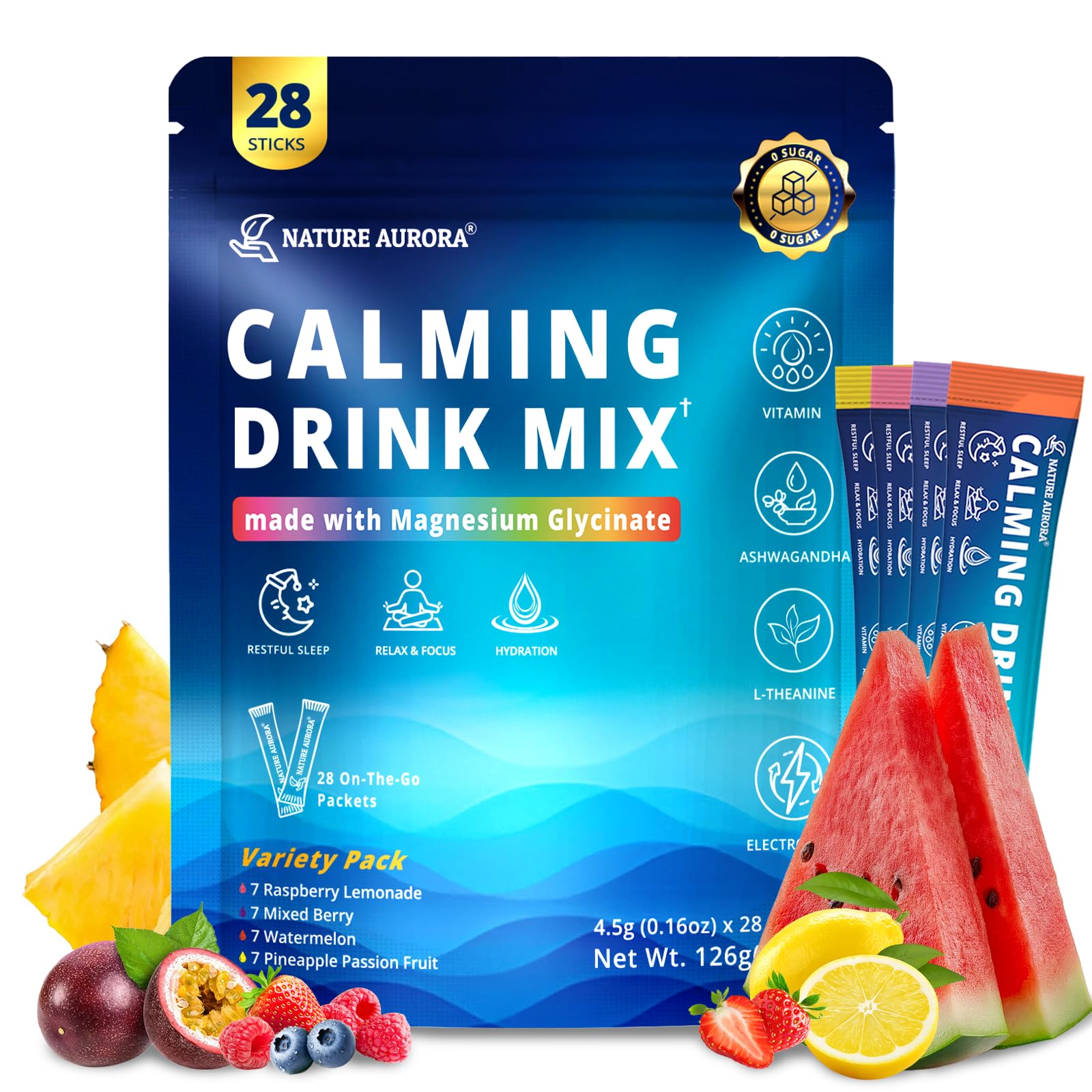 Cortisol Calm Drink Mix with Magnesium Glycinate Powder L-Theanine Vitamins Ashwagandha & Mushroom Calming Powdered Drink Mix for Relax Focus Sleep & Stress Relief Variety 28 Packets