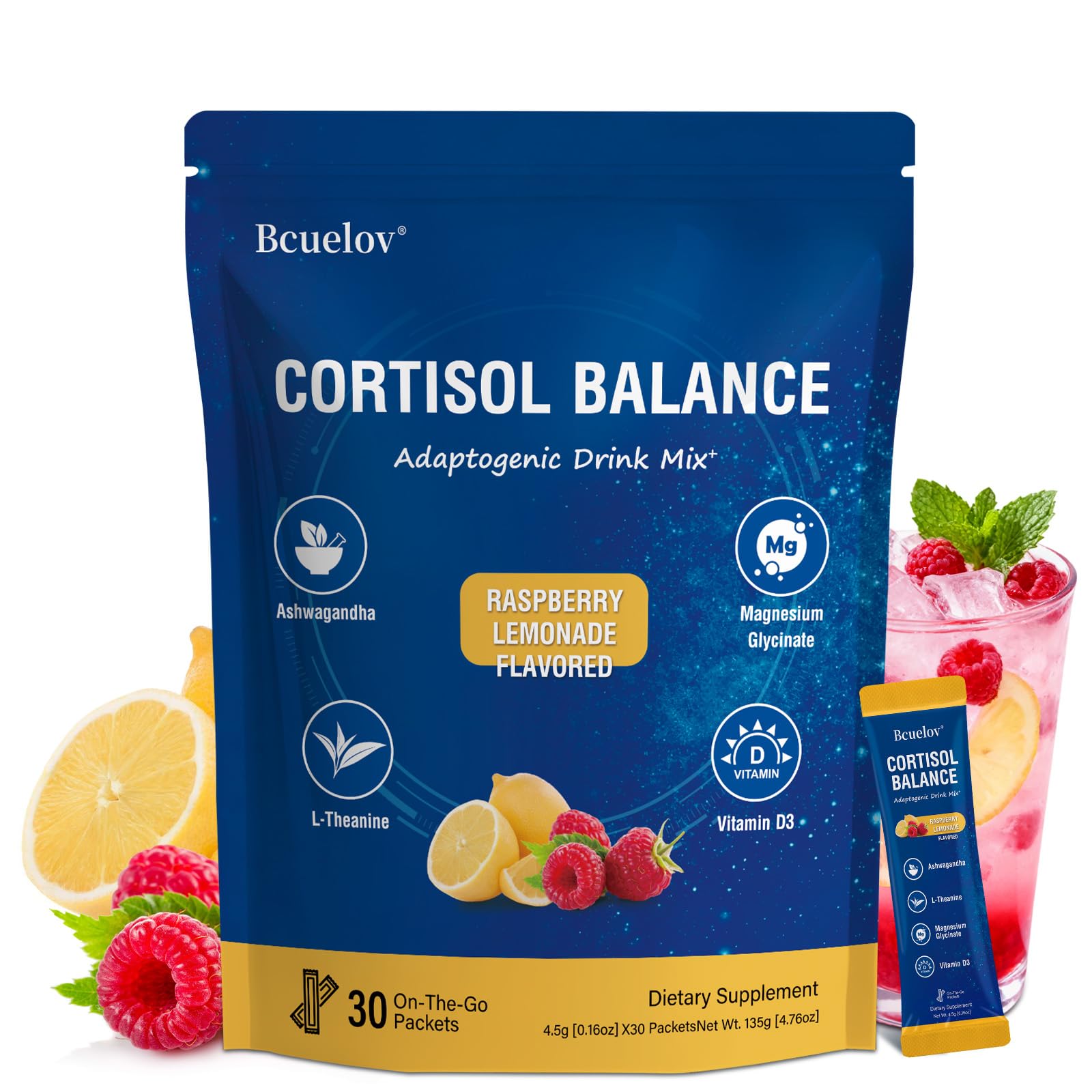 Cortisol Drink Mix Cortisol Supplements for Women Men with Magnesium Glycinate Ashwagandha L-Theanine Vitamin D 3 for Sleep & Relaxation On The Go 30 Ct (Raspberry Lemonade Flavor)