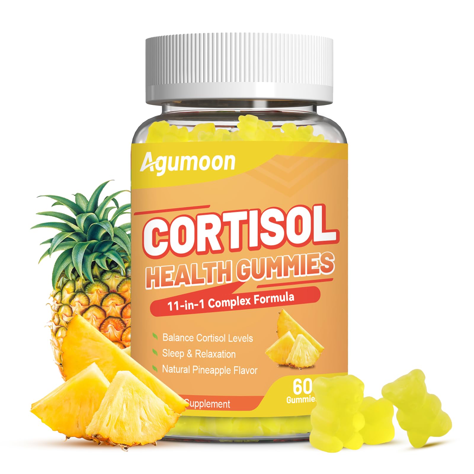 Delicious Pineapple Flavor: Our cortisol gummies have a pleasant taste, and a natural pineapple flavor. Delicious and yummy gummies for men and women, pleasant to chew. Take 2 cortisol supplement gummies and enjoy feeling relaxed and refreshed every day. Immune Support: Cortisol gummies for women contain vitamin b6, d3, magnolia bark and lion's mane mushroom extract to boost immunity. It also helps control cortisol levels, which are crucial for metabolism, while maintaining hormonal balance for both men and women. Cognitive and Memory Support: Featuring Phosphatidylserine and Rhodiola Rosea, our blend supports healthy brain function. Phosphatidylserine is a key nutrient for cognitive health, while Rhodiola Rosea promotes energy and mental clarity. Keep Women's Cortisol Calm: Agumoon cortisol supplement combines ashwagandha root extract and magnesium glycinate to support a sense of calm. Known for their adaptogenic properties, ashwagandha promotes a state of balance in women and magnesium glycinate supports nervous system and relaxation. 11-in-1 Support for Cortisol Balance: Agumoon cortisol gummies combine 11 synergistic blend with magnesium glycinate, ashwagandha, vitamin b6, phosphatidylserine, l-theanine and GABA to help maintain healthy cortisol levels and support overall daily balance.