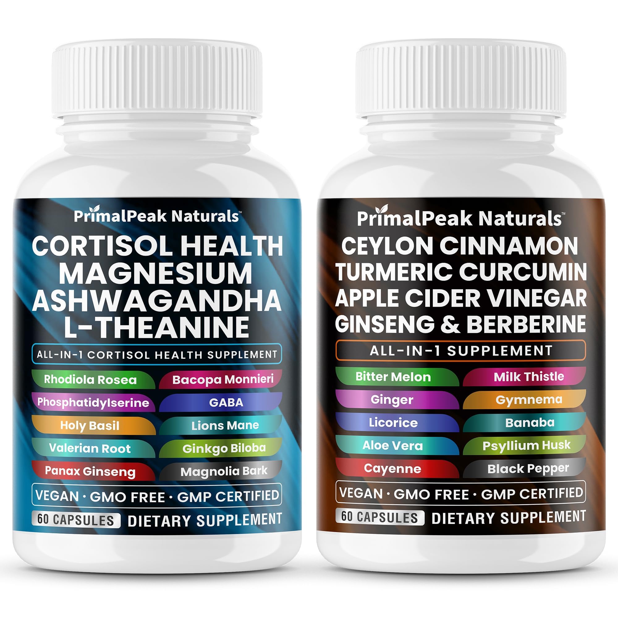 We're committed to supporting your wellness journey every step of the way so your satisfaction is our top priority. If you're not satisfied with your purchase for any reason, please don't hesitate to reach out and we'll be happy to help you. Quality Assurance: Our product is proudly made in a registered and certified facility and tested by third-party lab to ensure you receive only the highest quality and safest supplement. Simplify your wellness routine with PrimalPeak Naturals Supplement - a cost-effective, all-in-1 solution packed with multiple health benefits. Say goodbye to the cluttered cabinet filled with various separate supplements and embrace the ease of a 2-capsules daily dosage. Our powerful formula provides a comprehensive approach to well-being, ensuring you have everything you need for optimal health in one simple, convenient solution. Experience the power of nature with our premium Ceylon Cinnamon capsules Apple Cider Vinegar Pill (ACV) blend, combining 17 natural ingredients such as Panax Ginseng capsules, Turmeric with black pepper, Berberine with Ceylon Cinnamon, Bitter Melon and much more. We've expertly crafted this formula with carefully chosen ingredients to deliver unmatched purity and efficacy, embodying the essence of high-quality ceylon true cinnamon powder capsules and apple cider vinegar pills with the mother. Discover the powerful combination of Magnesium, Ashwagandha, L-Theanine, Phosphatidylserine, Rhodiola Rosea in our comprehensive Cortisol Health Supplement. This premium blend of magnesium glycinate, ashwagandha capsules, l theanine, panax ginseng, holy basil capsules and rhodiola supplement is expertly crafted to meet the demands of a fast-paced lifestyle and support overall wellness by aiding in the effective regulation of cortisol levels.
