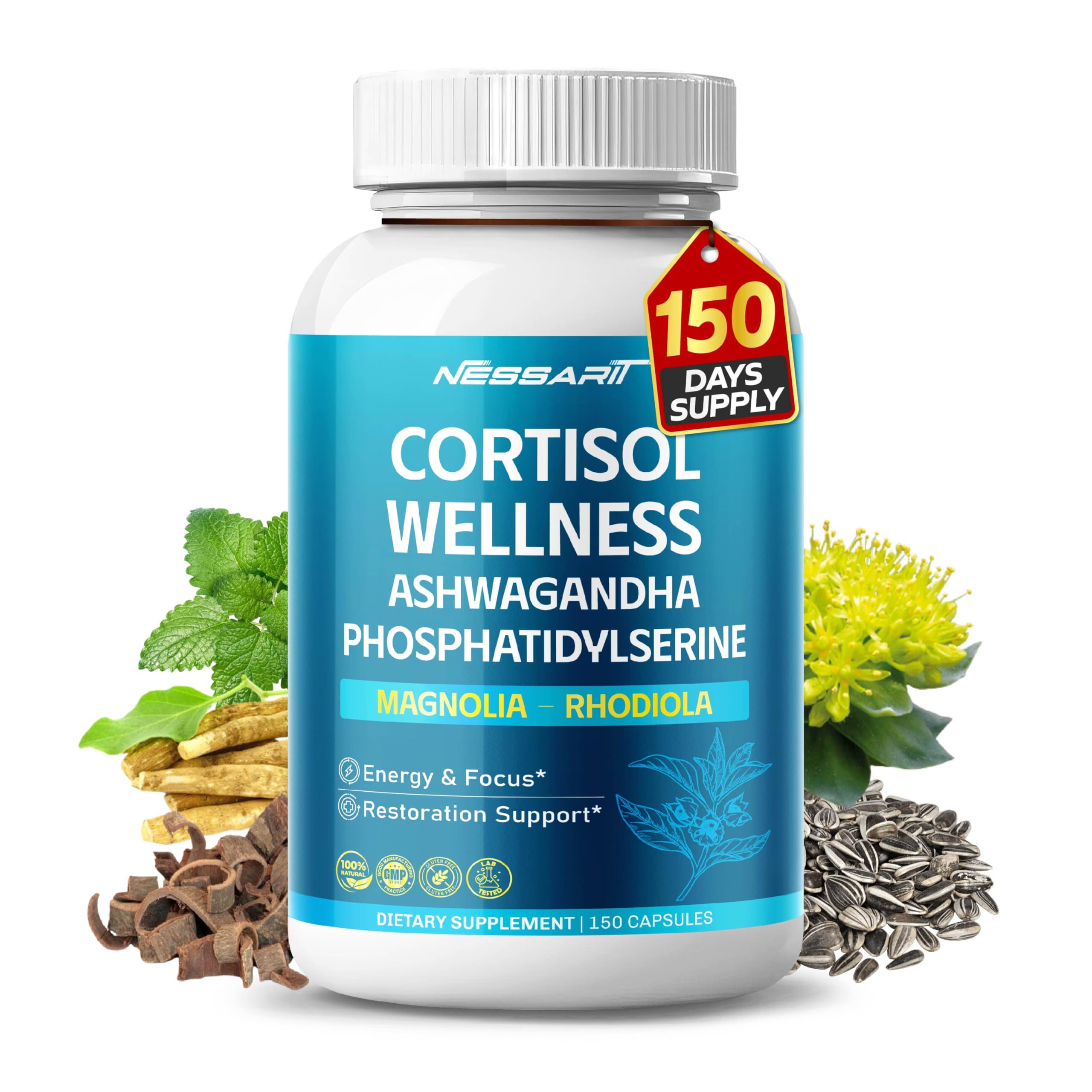 Nessarit Supplements: Laboratory Tested, Natural Ingredients, Premium Quality, Affordable Price. Natural and Excludes: gluten, wheat, yeast, milk, lactose, soy, artificial colors, flavors, and non-GMO components. Cortisol Wellness: With 14 lab-tested ingredients, this supplement aids in restoring and relaxing, balances hormones, and regulates energy levels. Promote Restful Sleep: This supplement includes stress-resisting ingredients that aid in recovery and enhance restful sleep. Amazing Offer: Get a 150-day supply of Nessarit Cortisol Wellness Supplement, providing with just one capsule a day!.