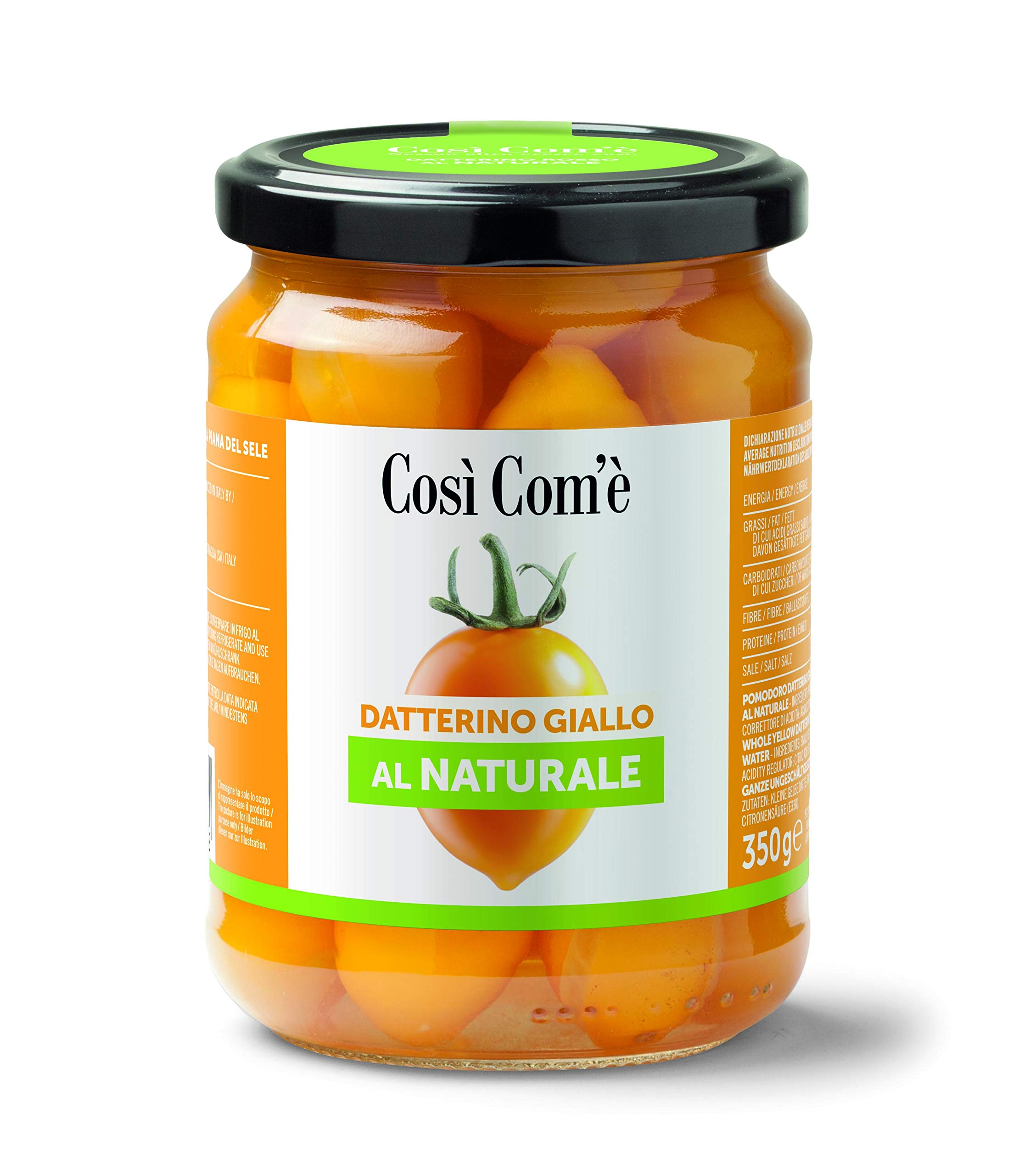Finagricola, which grows and packages the Cosi Come'é tomato range, has over 25 years of history and is one of the largest fruit and vegetable producers in Italy and abroad. Finagricola embodies the evolution of agricultural culture: a thriving fruit and vegetable producer that has grown and developed while maintaining an authentic and natural way of cultivating over the years. INGREDIENTS Datterini small yellow tomatoes, water, acidity regulator: citric acid.