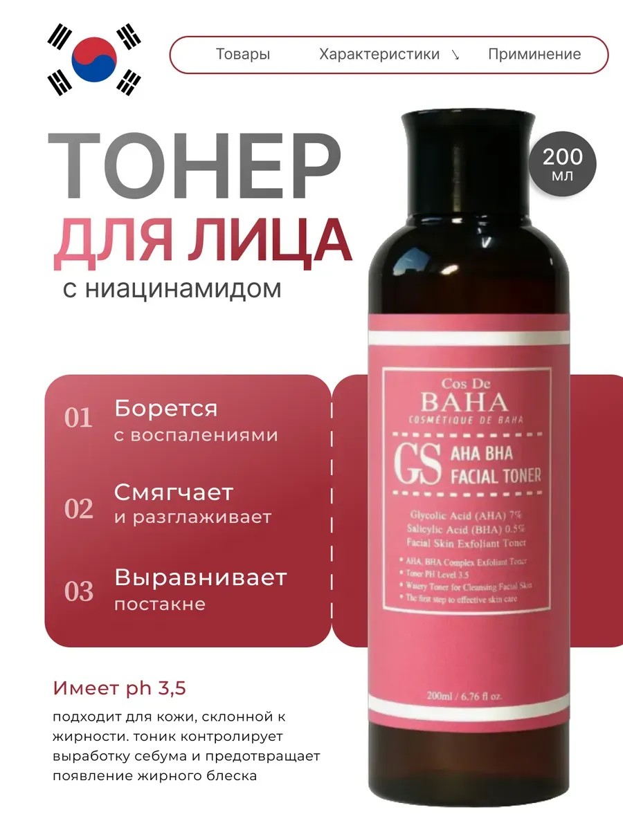 Кислотный тонер Cos De Baha AHA/BHA Facial GS бережно отшелушивает, уменьшает воспаления, угревую сыпь, чёрные точки и следы постакне. Средство смягчает дерму и выравнивает тон кожи, нормализует работу сальных желёз, снижает появление жирного блеска. Тонер глубоко очищает и сужает поры, предотвращает появление комедонов. Имеет pH 3,5, подходит для жирной, проблемной, комбинированной кожи. Гликолевая кислота отшелушивает кожу, стимулирует обновление эпидермиса, мягко разглаживает морщинки и кожные заломы, улучшает цвет лица. Салициловая кислота снимает воспаления, нормализует водно-жировой баланс. Экстракт гамамелиса сужает поры, укрепляет кожу и заживляет ранки. Ниацинамид усиливает естественную защиту кожи, увлажняет, успокаивает и осветляет кожу. Экстракты розмарина и эквалипта выравнивают рельеф кожи, поддерживают упругость и эластичность кожи. Экстракт алоэ вера мгновенно успокаивает кожу, приятно охлаждает и насыщает влагой.