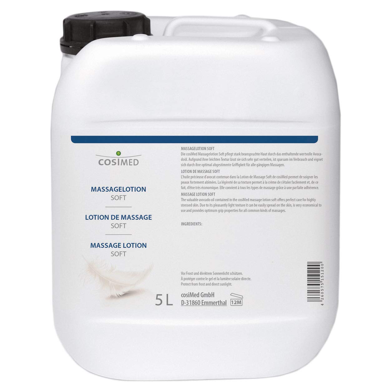 Massage Soft, 5 L The Cosimed Massagelotion Soft is ideal for heavily used skin.The high -quality avocado oil it contains is very well tolerated, especially when the skin is stressed and at the same time maintains it optimally.Thanks to the specially coordinated composition, the Massagelotion Soft can be distributed as best as possible and is extremely productive.The excellent grip is the basis for all common massages.