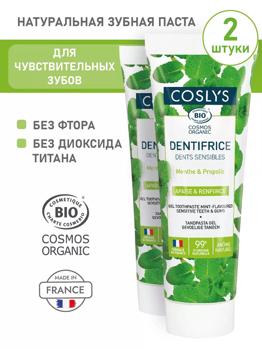 100 % Натуральная зубная паста для чувствительных зубов. Гелевая текстура 100% натуральной зубной пасты COSLYS обеспечивает бережное очищение зубов без повреждения эмали. Благодаря богатому микроэлементами и минеральными солями составу органическая паста помогает снизить чувствительность и укрепляет зубную эмаль.