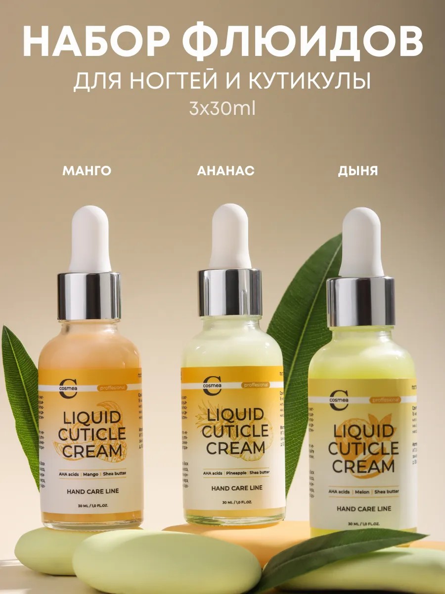 Набор жидких кремов флюидов для увлажнения кутикулы с ароматами манго, дыни, кокоса от Cosmea professional – ухаживает за ногтями и кутикулой, укрепляя их и предотвращая появление заусенцев.