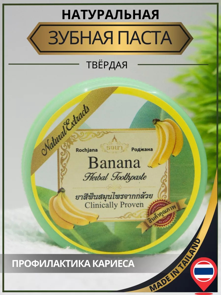 Круглая паста для зубов с банановым вкусом (Banana Thai Herbal Toothpaste) – натуральный, профилактически-лечебный продукт от проверенного тайского бренда Rochjana, подходящий для домашнего использования. Зубная отбеливающая паста имеет мятно-пряный вкус, превосходно сохраняет свежесть полости рта в течение всего дня.