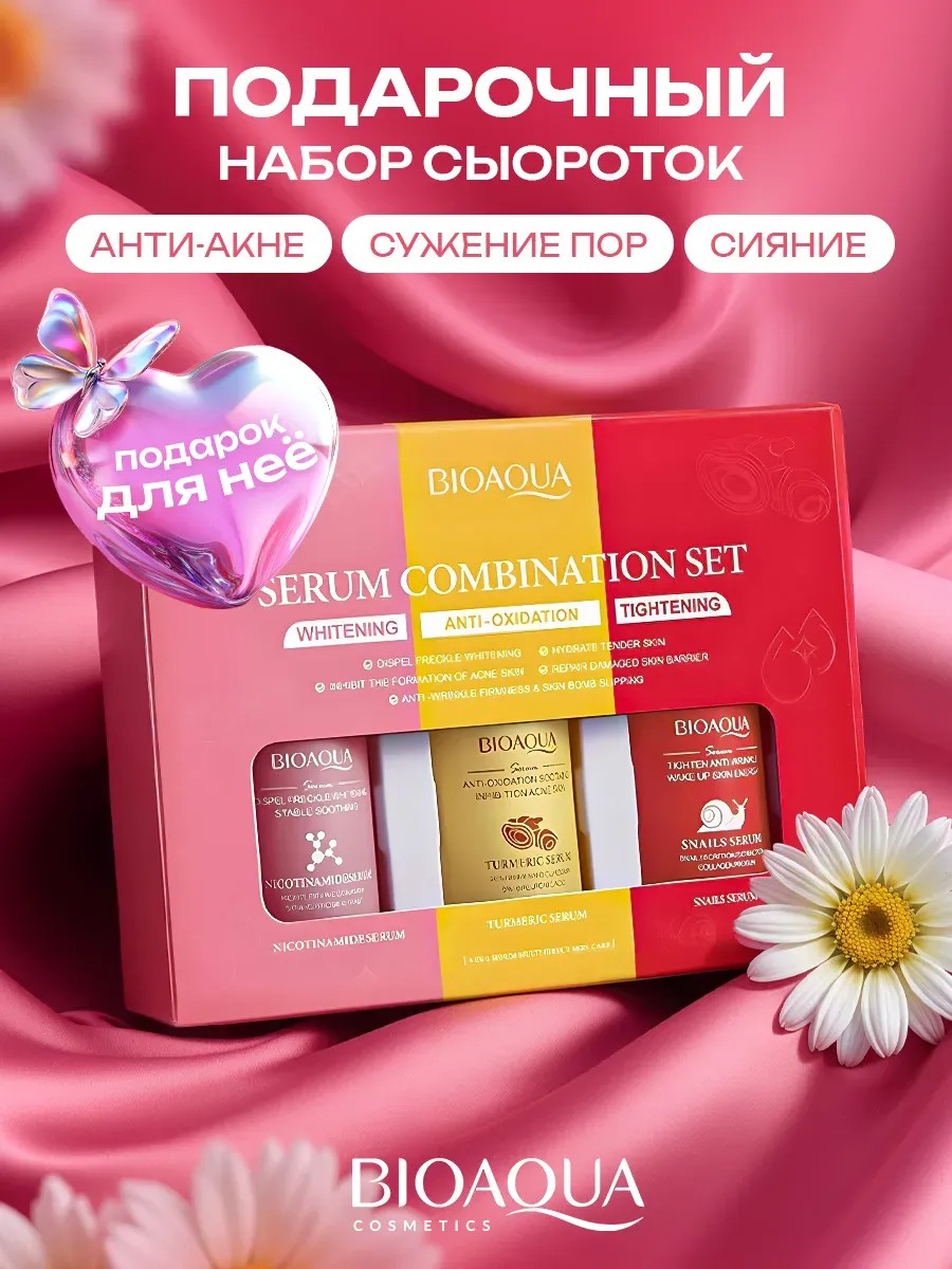 Cыворотка для лица — это прекрасный вариант базового ухода, который закрывает все потребности кожи и помогает устранить ее несовершенства. Главное преимущество средств от Bioaqua в ультралегкой текстуре, которая комфортно распределяется и быстро впитывается без липкого слоя. Сыворотки можно использовать как базу под макияж, чтобы косметика держалась дольше, а кожа была защищена от агрессивных внешних факторов. В набор входит три сыворотки. Антивозрастная с экстрактом улитки порадует вас выраженным омолаживающим эффектом, который сравним с применением ретинола. Она сокращает мимические морщины, улучшает рельеф и тон кожи. Благодаря заметному лифтинг-эффекту черты лица становятся более четкими уже после двух недель применения. Увлажняющая сыворотка с гиалуроновой кислотой эффективно борется с шелушением и сухостью кожи. Питательный экстракт куркумы в составе продукта улучшает защитные функции и усиливает регенерацию, уменьшает покраснения и число нежелательных высыпаний. Восстанавливающая сыворотка с ниацинамидом вернет коже эластичность и упругость. Мягкие осветляющие свойства выравнивают тон кожи и дарят ей здоровое сияние. Последовательное применение средств набора эффективно против многих несовершенств кожи любого возраста, в том числе подростковой: расширенные поры, черные точки, пигментация, акне и постакне. Профессиональные сыворотки для лица как подарочный набор косметики в фирменной упаковке это отличный подарок на 8 марта, 14 февраля или день влюбленных для любимой девушки, жены, мамы, бабушки, сестры, подруги, учителю или для коллег.