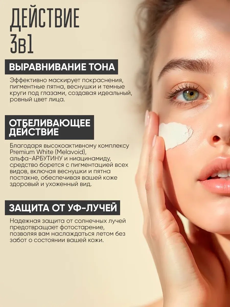 Подарите вашей коже свежесть и сияние с нашим уникальным средством, которое маскирует несовершенства и оживляет тусклый цвет лица. Это универсальное решение предлагает функциональность 3 в 1, обеспечивая не только визуальное улучшение, но и активный уход за вашей кожей. Основные преимущества: Выравнивание тона: эффективно маскирует покраснения, пигментные пятна, веснушки и темные круги под глазами, создавая идеальный, ровный цвет лица. Отбеливающее действие: Благодаря высокоактивному комплексу Premium White (Melavoid), альфа-АРБУТИНУ и ниацинамиду, средство борется с пигментацией всех видов, включая веснушки и пятна постакне, обеспечивая вашей коже здоровый и ухоженный вид. Защита от УФ-лучей: Надежная защита от солнечных лучей предотвращает фотостарение, позволяя вам наслаждаться летом без забот о состоянии вашей кожи. Ключевые ингредиенты: Альфа-АРБУТИН: Один из самых эффективных и безопасных компонентов для борьбы с пигментацией и неровным тоном кожи. Он ингибирует выработку меланина, осветляет темные круги и защищает кожу от негативного воздействия внешней среды, придавая ей гладкость и ухоженный вид. Ниацинамид: Этот мощный ингредиент снижает пигментацию, стимулирует выработку коллагена и эластина, сужает поры и значительно улучшает цвет лица. Применение: Для достижения наилучших результатов, нанесите небольшое количество средства на очищенную кожу лица и равномерно распределите, позволяя ингредиентам активно воздействовать на вашу кожу. Подарите себе уверенность и красоту каждый день с нашим средством, которое не только скрывает несовершенства, но и заботится о вашей коже.