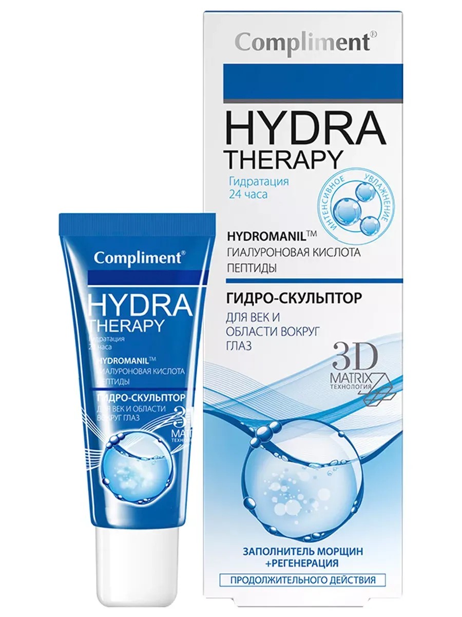 Compliment Hydra Therapy Гидро-скульптор для век и области вокруг глаз 25мл. Увлажняющий и успокаивающий гидро-скульптор заполняет морщины и восстанавливает нежную кожу вокруг глаз, насыщая ее влагой и предотвращая преждевременное старение. Благодаря легкой молекулярной структуре крем для глаз равномерно распределяется по коже, быстро впитывается, заполняет неровности и укрепляет кожу. Вы увидите, как под пальцами морщинки расправляются, становятся менее глубокими, а границы их разглаживаются. Раз за разом гидро-скульптор также восполняет потерю влаги и насыщает клетки активными живительными компонентами. Уменьшает глубину морщин. Интенсивно увлажняет. Выравнивает рельеф кож. Способствует осветлению темных участков. Крем увлажняющий для кожи вокруг глаз заметно сокращает морщины. Применение: Наносите гидро-скульптор мягкими точечными движениями на очищенную кожу вокруг глаз. Используйте утром и вечером. Подходит под макияж.