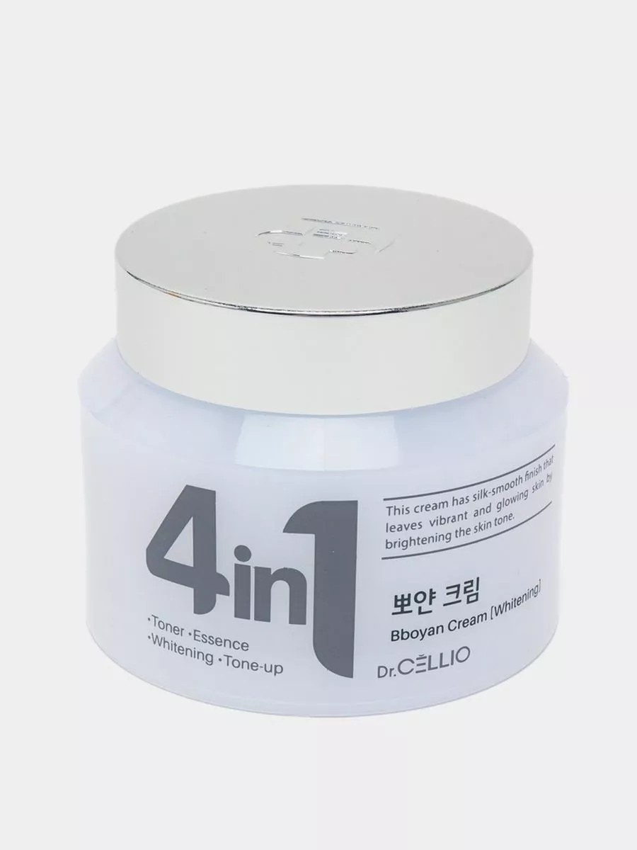 Dr. Cellio G50 4 in 1 Bboyan Whitening Cream. This brightening face cream moisturizes and instantly transforms dry, dull, and pigmented skin, effectively evens out tone, and improves firmness and elasticity. Contains niacinamide, which effectively combats pigmentation of various origins, stimulates collagen synthesis, thereby smoothing the microrelief, soothes irritated and sensitive skin, and has a powerful antioxidant effect. Directions: Apply a small amount of cream to the face with gentle movements. Volume: 70 ml