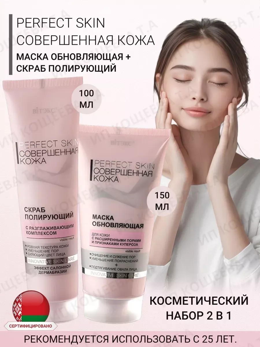 Косметический набор для ухода за лицом Совершенная кожа включает в себя: Маска обновляющая для кожи с расширенными порами и признаками купероза 150мл +СКРАБ ПОЛИРУЮЩИЙ с разглаживающим комплексом - Эффект салонной дермабразии 100мл. от Витэкс. Обновляющая маска, благодаря своей активной формуле, способствует совершенствованию внешнего вида кожи. Белая и красная глина бережно и глубоко очищают поры, выравнивают текстуру кожи. Комплекс инновационных компонентов Еpidermist и Biophytex:Сужает поры*Делает кожу заметно более гладкой и сияющей*Уменьшает покраснения, укрепляет капилляры**Подтягивает овал лицаЭффект доказан компаниями *Codif (France) и **BASF (France)Результат: поры менее заметны, овал лица подтянут, цвет лица более ровный. Максимальный результат достигается при комплексном применении всех средств линии. Эффект накапливается и сохраняется надолго.Рекомендуется использовать с 25 лет.Правила наложения маски:Тщательно очистите лицо демакияжем.Накладывайте маску аккуратно, по массажным линиям: от подбородка к вискам, от верхней губы к мочке уха, от спинки носа к вискам.Расслабьтесь, успокойтесь, примите горизонтальное положение. Можно подложить под ноги небольшую подушечку. Вокруг глаз маску накладывать не следует. Через 15-20 минут смойте маску водой либо тоником.После процедуры обязательно нанесите крем, подходящий Вашему типу кожи.Наслаждайте свежей, сияющей, обновленной кожей! Скраб полирует и выравнивает поверхность кожи. Поры глубоко очищаются, улучшается клеточное обновление, кожа становится заметно более гладкой и мягкой. Благодаря уникальным тающим частицам эксфолианта, процедура очищения кожи проходит максимально бережно. Комплекс компонентов Epidermistи Neurobiox: Делает кожу более гладкой и сияющей* Выравнивает поверхность кожи*Уменьшает поры**Разглаживает морщинки**Результат: идеально ровная гладкая кожа, сияющий цвет лица. Эффект накапливается и сохраняется надолго. Подходит для кожи любого типа. Рекомендуется использовать с 25 лет.