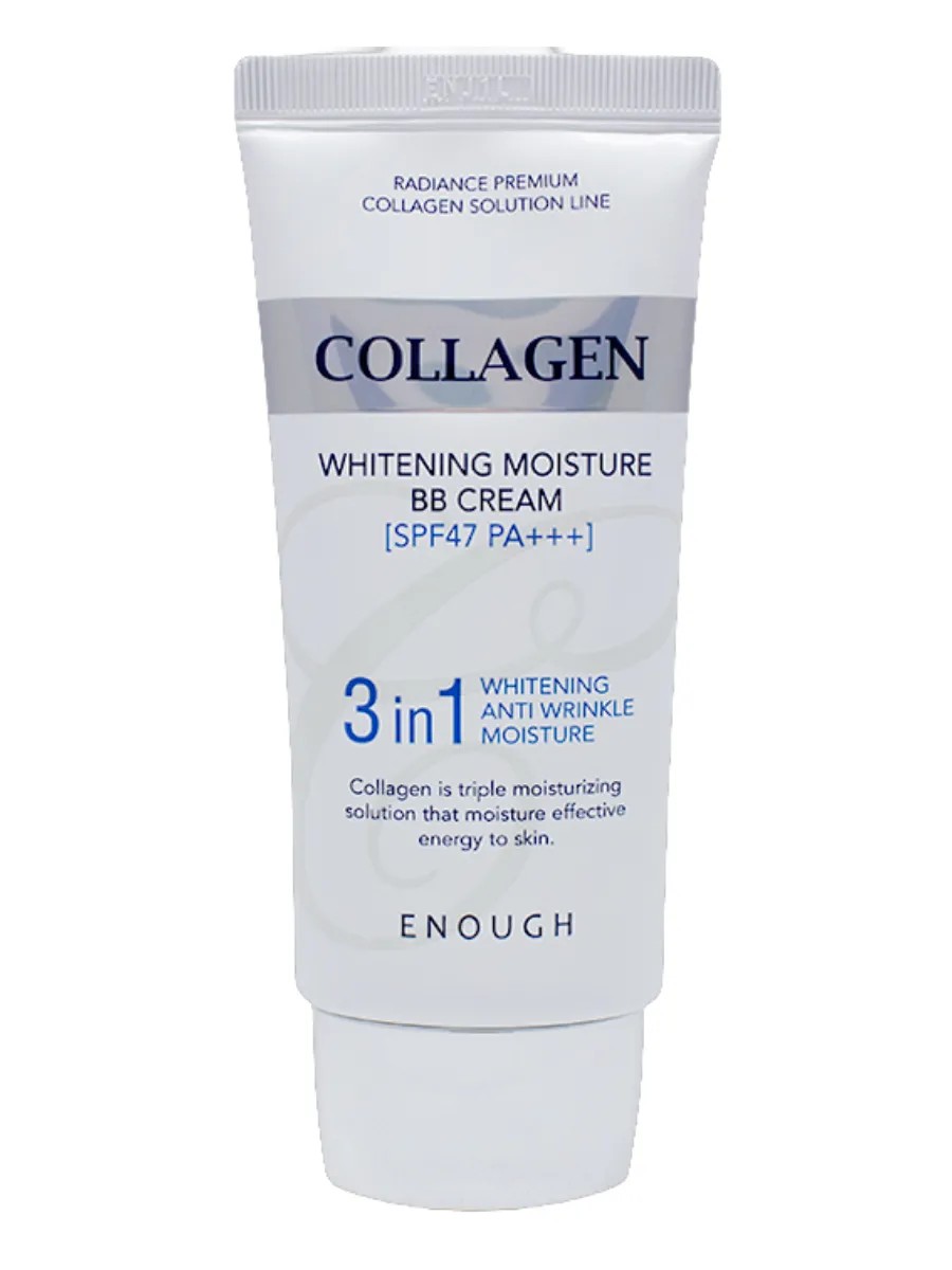 ВВ крем Enough Collagen 3 in 1 Whitening Moisture BB Cream SPF47 PA+++ это многофункциональное средство, которое позволяет добиться заметного улучшения внешнего вида сразу после нанесения, а при регулярном применении кожа становится более подтянутой и разглаженной, выравнивается тон лица. ББ крем 3 в 1 способствует увлажнению кожи, осветлению пигментации и разглаживанию морщин.