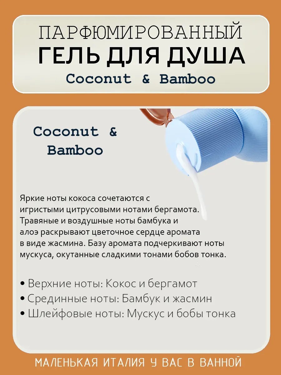 Парфюмированный гель для ванны и душа 'Живительный аромат' Кокос и Бамбук 650 мл. Это средство для интенсивного ухода за кожей тела, рук и ног. Гель для тела подарит сладкий и расслабляющий аромат, увлажняет сухую и чувствительную кожу, делая гладкой и мягкой на ощупь. Яркий аромат кокоса и свежесть бамбука геля для душа, дарят моменты радости и энергии во время принятия душа или ванны, деликатно очищая вашу кожу, увлажняя ее и оставляя изысканный аромат надолго. Яркие ноты кокоса сочетаются с игристыми цитрусовыми нотами бергамота. Травяные и воздушные ноты бамбука и алоэ раскрывают цветочное сердце аромата в виде жасмина. Базу аромата подчеркивают ноты мускуса, окутанные сладкими тонами бобов тонка. Верхние ноты: Кокос и бергамот. Срединные ноты: Бамбук и жасмин. Шлейфовые ноты: Мускус и бобы тонка. Моющее средство подходит для проблемной и чувствительной кожи - бережно очищает кожу, не вызывая раздражения и сухости. Хорошо пенится, образуя воздушную пену, поэтому бутылки объемом 650 мл хватит надолго. Аромат для душа отлично увлажнит и смягчит вашу кожу, аромат полностью раскроется на коже во время применения геля. Увлажняющий аромагель понравится как мужчинам, так и женщинам, подарит настоящий заряд бодрости и свежести, снимет стресс после тяжелого дня (анти стресс). Уходовая брендовая косметика для личной гигиены – полезный подарок для девочек и девушек, подростков и коллег, мальчиков, взрослых и детей. Увлажняющий гель для душа подходит для женщин и мужчин.