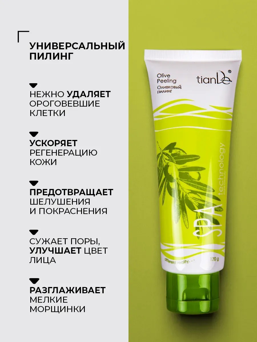 Мягкий оливковый пилинг для лица объединяет в себе очищение и уход. Отшелушивающий и обновляющий кожу кислотный пилинг (peeling)- скатка бренда TianDe из линейки Spatechnology выравнивает тон кожи и помогает вернуть ей красоту и сияние. Косметический пилинг подойдет для всех типов кожи: нормальной, жирной, проблемной и комбинированной, а также сухой, чувствительной и возрастной. В состав средства входят натуральные компоненты. Оно содержит комплекс фруктовых кислот (АНА-кислот): гликолевую, молочную, яблочную, винную, лимонную, а также салициловую кислоту, масло плодов оливы и аминокислоты коллагена. Кислоты в составе пилинга способствуют уменьшению фоточувствительности кожи. Они обладают антиоксидантными, очищающими, увлажняющими, противовоспалительными и вяжущими свойствами, а также усиливают клеточный метаболизм. Оливковое масло содержит родственные коже жирные кислоты, которые отлично усваиваются, повышая ее тонус и разглаживая мелкие морщинки. Аминокислоты коллагена прекрасно увлажняют кожу, делают ее более упругой и эластичной, поддерживают баланс кожи лица. Очищающий пилинг поможет вам избавиться от черных точек и расширенных пор на носу, лбу и подбородке, прыщей, угрей и рубцов постакне. Оливковый пилинг скатка SPA technology выравнивает микрорельеф и тон кожи, улучшает микроциркуляцию крови и способствует обновлению клеток кожи. Не содержит абразивных частиц, очищает без шелушения и гиперемии, обеспечивает пролонгированный эффект, подходит для любого возраста и типа кожи. Способ применения: Нанесите небольшое количество пилинга сухими руками на сухое очищенное лицо, исключая область вокруг глаз, помассируйте 1-2 минуты. Затем тщательно смойте прохладной водой. После пилинга не рекомендуется загорать. Частота проведения процедуры 1-2 раза в неделю.