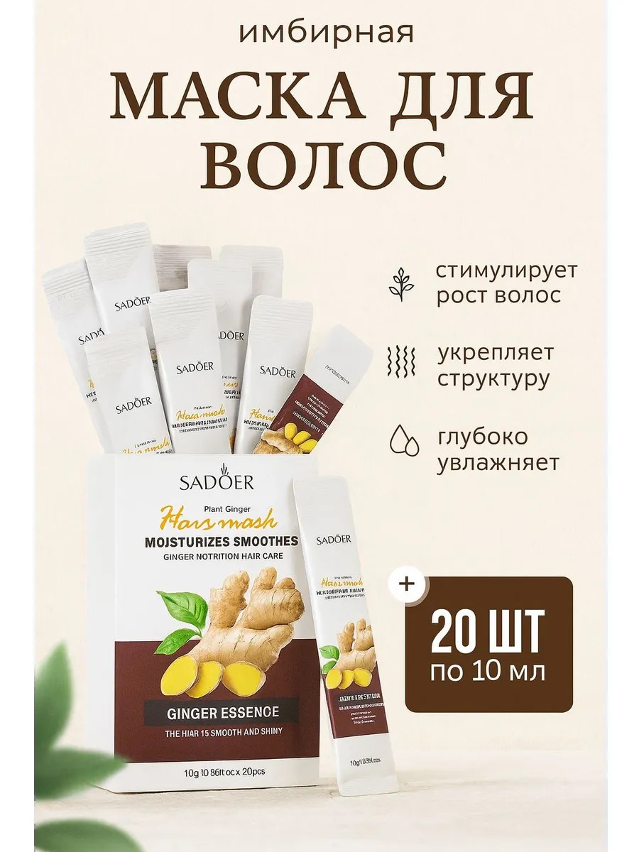 Маска для волос с имбирем Sadoer Ginger Essence Hair Mask Маска с экстрактом имбиря - идеальное средство для укрепления корней, стимуляции роста волос, нормализации выработки себума. Маска обладает разогревающим действием: она стимулирует усиление кровообращения в коже головы, что приводит к активизации роста волос. В упаковке 20шт по 10гр