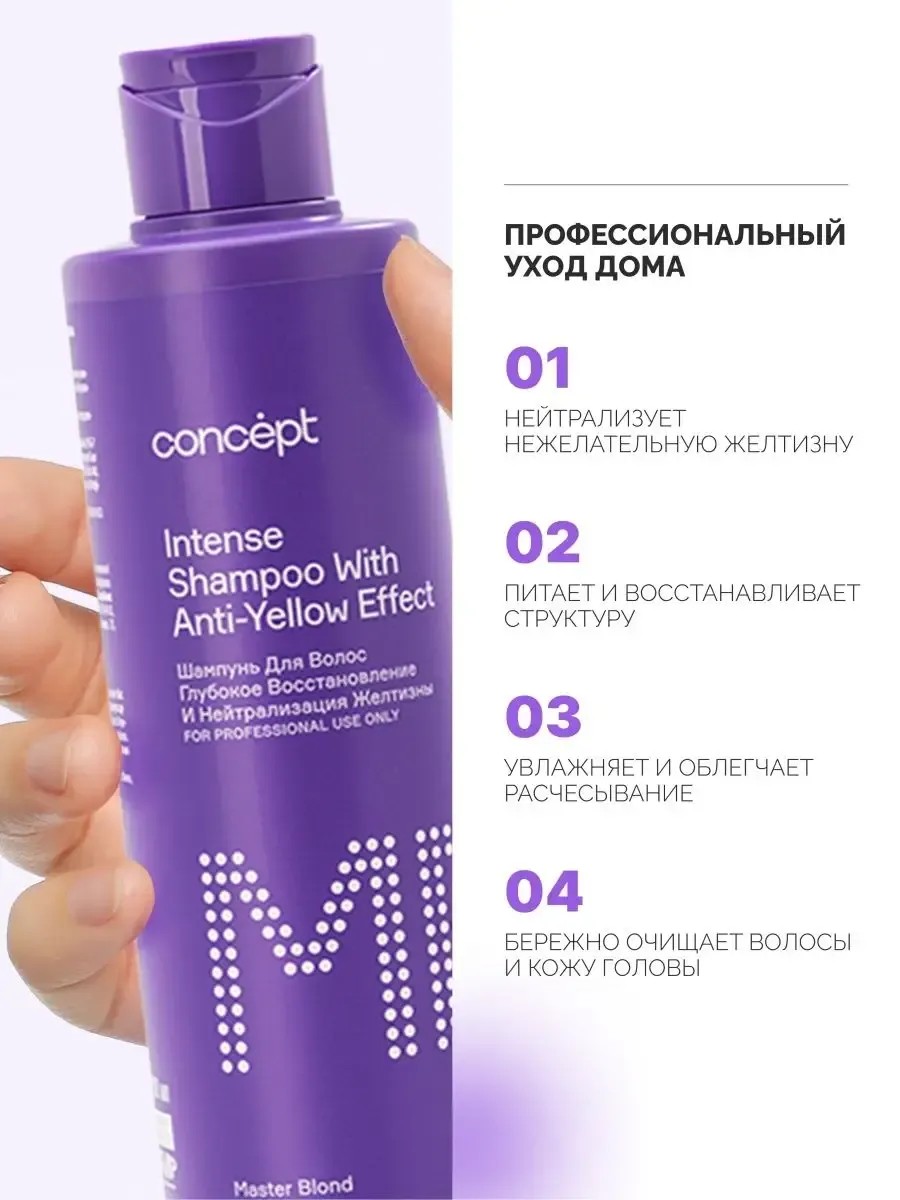 Concept Intense Shampoo with Anti-Yellow Effect. This yellow-neutralizing shampoo gently cleanses and conditions bleached hair, thanks to its keratin complex. This blonde shampoo restores damaged and dry hair. This violet shampoo tones hair with a cool shade, maintaining or correcting the color result. It neutralizes unwanted yellow tones in bleached and blonde hair. This professional shampoo gently cleanses and conditions hair, thanks to its keratin complex. This professional anti-yellow shampoo cleanses, creates a shimmering effect and pure, radiant highlights, adding brightness to colored and bleached hair, enlivening an attractive, smoky, cool color. This shampoo is suitable for light, bleached, highlighted, and gray hair of any texture: curly, curly, straight, and wavy. This toning anti-yellow shampoo has a thick, creamy consistency with a pleasant, subtle scent. It protects color from fading, oxidation, hair loss, and sun fading. This cosmetic product provides care for curly, frizzy, and oily hair. Keratin in this anti-yellow shampoo restores and protects damaged, porous hair, restoring its natural shine and smoothness. This professional shampoo for bleached, highlighted, and gray hair provides multifaceted shine, softness, and elasticity. This product makes a perfect gift for any occasion.