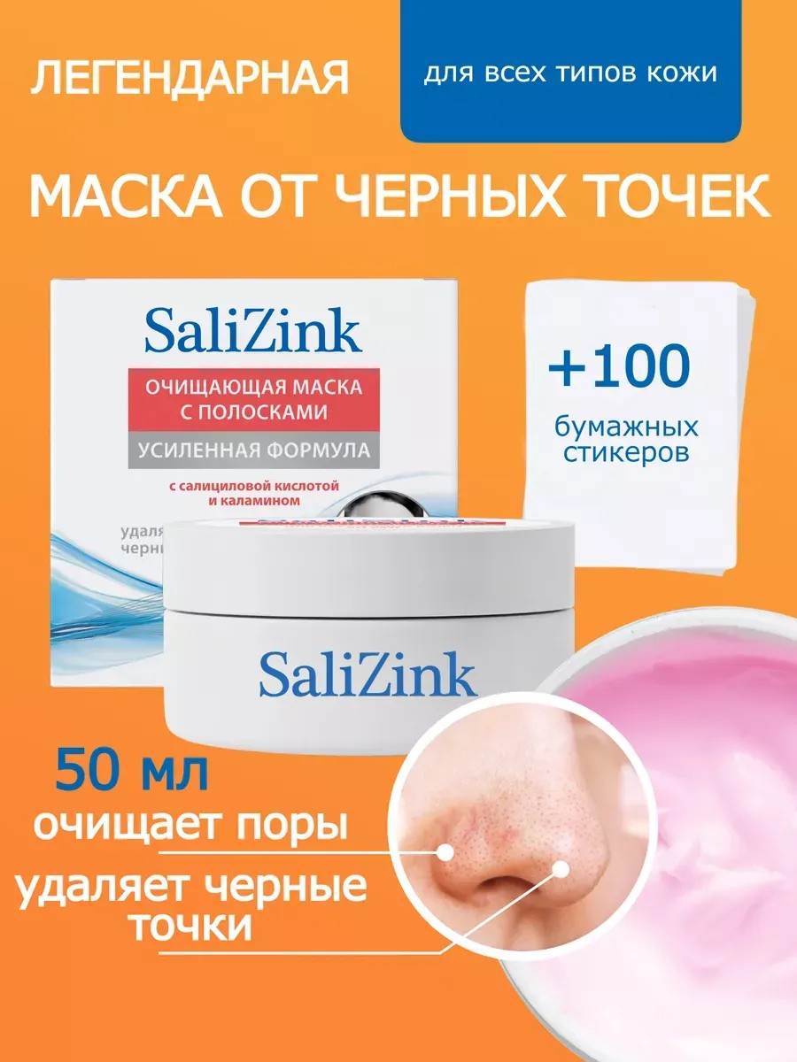 Salizink Blackhead Cleansing Mask for all skin types. Easily and quickly removes blackheads, impurities, and excess oil from the face. Prevents breakouts. Salicylic acid, calendula, and calamine combat breakouts and help eliminate bacteria and inflammation on problem skin. Allantoin, panthenol, aloe vera, and hyaluronic acid soften and condition the skin. Does not contain mineral oils. Contraindications: Individual intolerance to any of the ingredients. Avoid contact with eyes, mucous membranes, and damaged skin. Directions for use: Steam your skin in the shower or bath to open the pores. Pat your skin dry. Apply a thin layer of the mask to the blackhead area using a cotton swab or brush. Cover with a paper sticker and smooth gently. After 10-15 minutes, ensure the mask is completely dry and carefully remove the sticker. Rinse off any remaining mask with warm water. For enhanced results, pre-treat the affected area with SaliZink scrub. Composition AQUA (WATER), PVP, GLYCERIN, POLYVINYL ALCOHOL, MONTMORILLONITE, TITANIUM DIOXIDE, PEG-40 HYDROGENATED CASTOR OIL, PARFUM, GELATIN, PROPYLENE GLYCOL, PHENOXYETHANOL, CALAMINE, SALICYLIC ACID, ALLANTOIN, PANTHENOL, SODIUM HYALURONATE, ALOE BARBADENSIS LEAF EXTRACT, CALENDULA OFFICINALIS FLOWER EXTRACT, ETHYLHEXYLGLYCERIN, CITRIC ACID, CI 12490, IODOPROPYNYL BUTYLCARBAMATE, SODIUM LAURETH SULFATE.