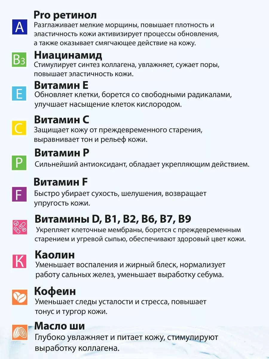 Восстанавливающая маска для лица подходит для всех типов кожи. Она смягчает, питает и восстанавливает кожу, придаёт ей здоровый цвет и способствует клеточному обновлению. Pro ретинол и Ниацинамид разглаживают мелкие морщины, повышают тонус, плотность и эластичность кожи и стимулируют синтез коллагена. Витамин С защищает кожу от преждевременного старения, выравнивает тон и рельеф кожи. Витамины Е, P и F борются со свободными радикалами, убирают сухость, шелушения и возвращают упругость кожи. Каолин, кофеин и масло ши уменьшают воспаления, жирный блеск, убирают следы усталости и стресса, а также стимулируют выработку коллагена.