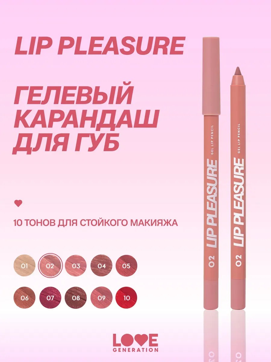Сплошное удовольствие и красота для твоих губ! Стойкий гелевый карандаш в 10 оттенках поможет создать идеальный контур. Большая палитра цветов (базовые, нюд и яркие цветные) поможет создать трендовый образ с эффектом увеличения губ или нежный нюдовый. Сделай с ним макияж и отправляйся на свидание, прогулку, в музей — карандаш LIP PLEASURE останется на твоих губах при любых условиях :) Губной карандаш не сушит кожу, идеально прорисовывает контур и не растекается в течение дня. СПОСОБ ПРИМЕНЕНИЯ: Наноси карандаш на всю поверхность губ для полноценного макияжа. Можно дополнить его декоративной косметикой: матовой помадой, блеском, бальзамом, маслом для губ или тинтом. Или используй только для эффектного конутра - подводки для губ. Чтобы сделать карандаш более острым, воспользуйся любой косметической точилкой (в набор не входит).