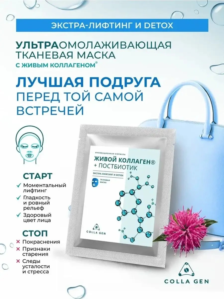 A new WOW product for instant lifting! Now all the properties of LIVING COLLAGEN are packed into a sheet mask! It contains a powerful concentration of effective ingredients to make your skin glow with youth, health, and beauty! The mask's innovative formula provides active lifting, initiates detox processes at the cellular level, and reduces expression wrinkles. Thanks to bio-peptides, postbiotics, aloe vera leaf extracts, white tea, and Korean centella, the mask tones, helps strengthen vascular walls, evens out skin tone, and improves firmness and elasticity. Recommended for daily use for 14 days. Directions for use: Remove and unfold the mask, apply to a cleansed face, and smooth, achieving maximum contact with the skin. Leave the mask on for 20 minutes, then remove and smooth any remaining product over the skin until completely absorbed. For single use only. Precautions: Avoid contact with eyes. Individual intolerance to the product components is possible. Do not apply to irritated, inflamed, or damaged skin. Storage conditions: Store at temperatures between +5°C and +25°C, protected from sunlight and away from heating devices.