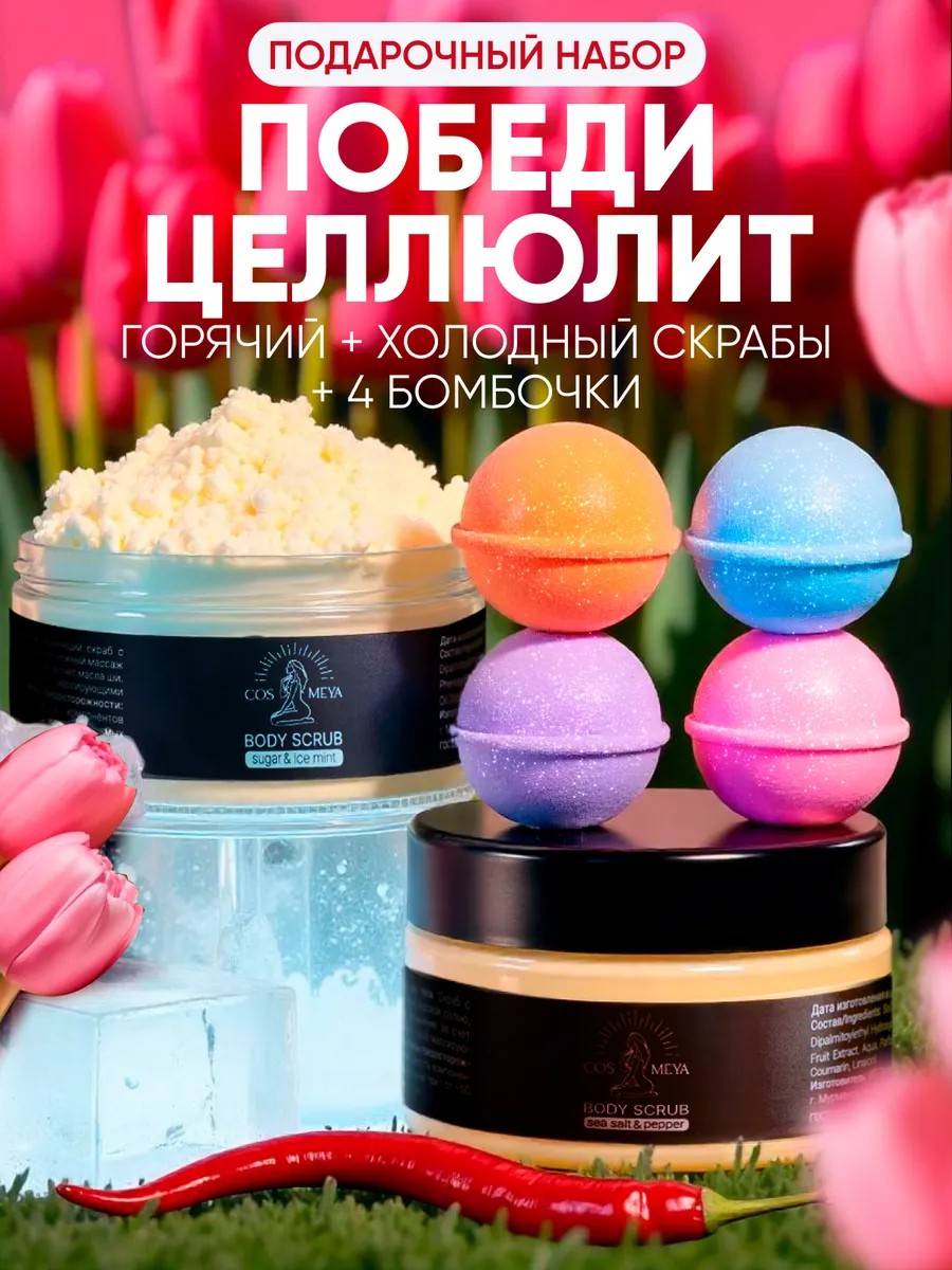 Набор скрабов для тела антицеллюлитный Космея - эффективное средство для борьбы с избыточными жировыми отложениями и целлюлитом. Отличный уход за телом и ногами. Горячий скраб для тела разогревающий с экстрактом перца чили и морской солью создает термоэффект, который усиливает метаболизм и активно стимулирует жиросжигающие процессы. Происходит активный лимфодренаж, и жировые клетки расщепляются под влиянием тепла. Отличное средство для похудения и от целлюлита. Частички сухой морской соли осуществляют активный массаж кожи, выравнивая кожный рельеф. Отшелушивающий и соляной, он создает эффект обертывание. Избавит вас от "апельсиновой корочки". Эффект горячее обвертывание за 5 минут - удобнее, чем ходить с пленкой. Идеален для использования после бани, сауны, а также для ванны и душа. Удаляет омертвевшие частички эпидермиса, стимулирует кровообращение и выводит токсины. Регулярное использование делает кожу эластичной, гладкой и упругой. Холодный с маслами сдвинет вес с мертвой точки, объемы уходят прямо на глазах за счет снятия отечности. Антицеллюлитный скраб идеален, чтобы взять с собой в баню. По-настоящему сильный перепад температур коже обеспечен. Оказывает лифтинг эффект.