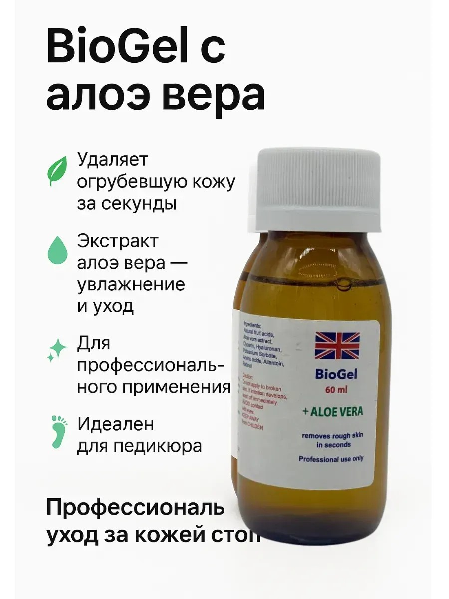 BioGel 60 ml с алоэ вера — профессиональное средство для ухода за кожей стоп, которое быстро и эффективно удаляет огрубевшую кожу, мозоли и натоптыши. Благодаря активным компонентам (натуральные фруктовые кислоты, алоэ вера, гиалуронат, ретинол и аминокислоты) гель бережно размягчает и увлажняет кожу, делая её гладкой и ухоженной уже после первого применения.