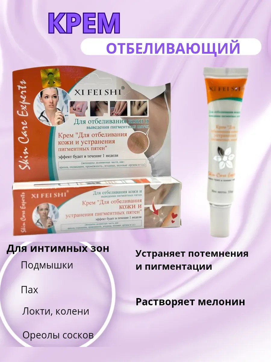 Крем для отбеливания кожи обладает лечебным эффектом, постепенно растворяет меланин и устраняет пятна вызванные трением (зона бикини, подмышки, ягодицы). Лечебный крем отбеливает пигментацию. Увлажняющий крем делает кожу деликатных зон мягкой и гладкой. Крем против пигментов имеет натуральный состав. Отбеливающий крем для интимных зон выравнивает тон, создаёт единый здоровый тон кожи. Осветляющий крем проникает глубоко в кожу, восстанавливает её структуру и способствует естественному осветлению.
