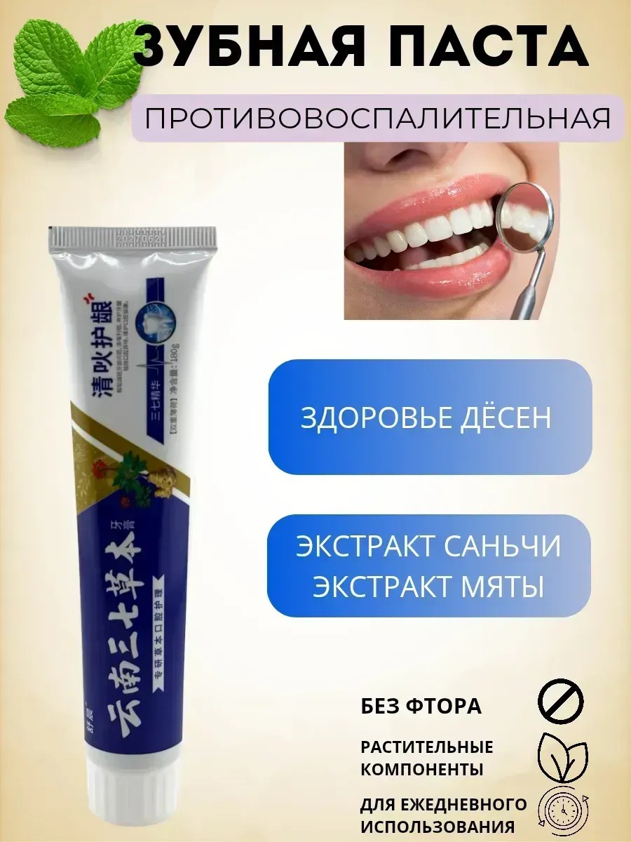 Зубная паста китайская с экстрактом саньци (Panax notoginseng) — это эффективное противовоспалительное средство для ежедневного ухода за полостью рта. Продукт от воспаления десен разработан на основе натуральных растительных компонентов китайской медицины, оказывает противовоспалительное, укрепляющее и освежающее действие. Она глубоко очищает полость рта, устраняет неприятный запах и предотвращает кровоточивость десен. Подходит для людей с чувствительными зубами и проблемами десен: пародонтоз, воспаления, кровоточивость. растительные компоенты в составе средства ухаживает за эмалью и способствует восстановлению тканей. Паста с женьшенем обладает лёгким освежающим вкусом и не содержит агрессивных химических компонентов. Она подходит для всей семьи и может использоваться ежедневно. Объём тюбика — 210 г, что обеспечивает длительное использование.