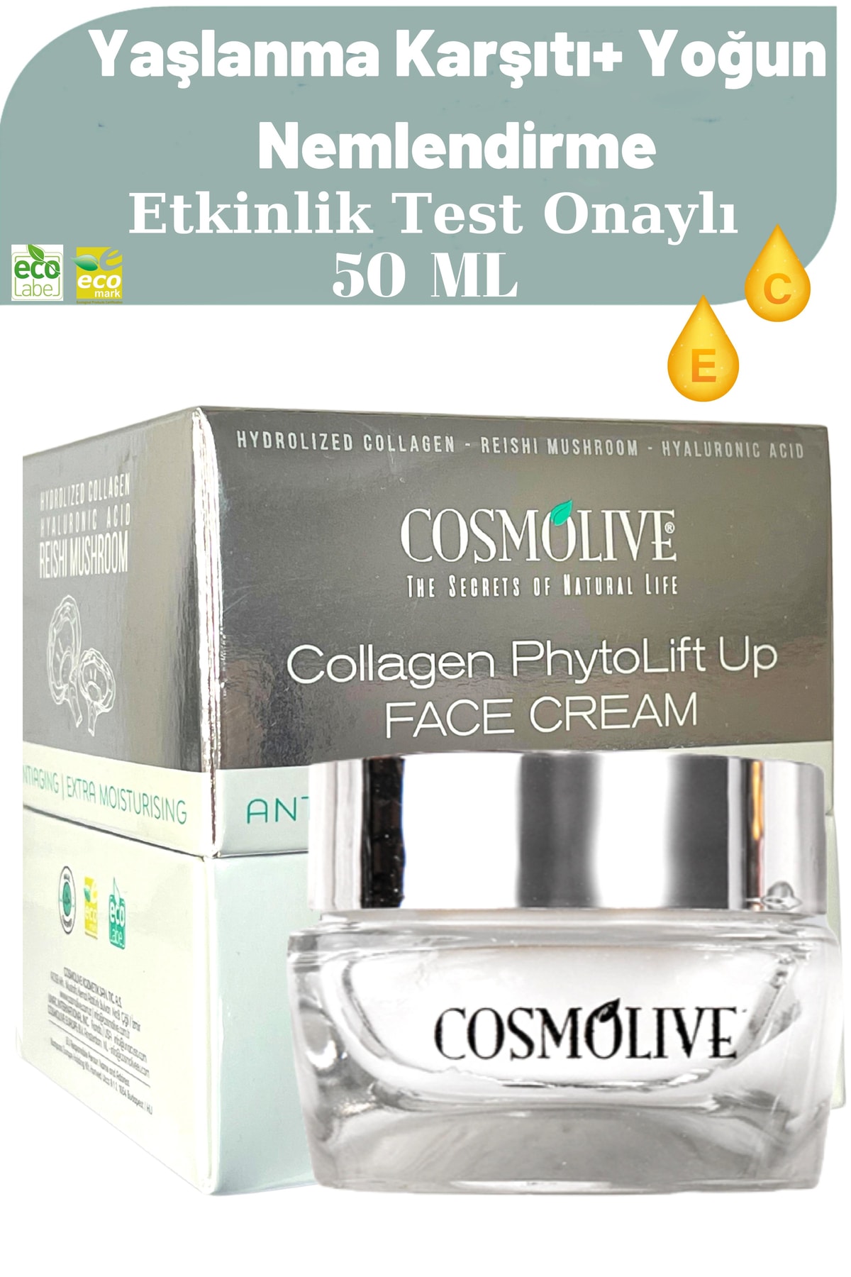 Cosmolive Collagen PhytoLift Up Face Cream, içerigindeki kolajen, hyalüronik asit ile cilt yapisini destekler.