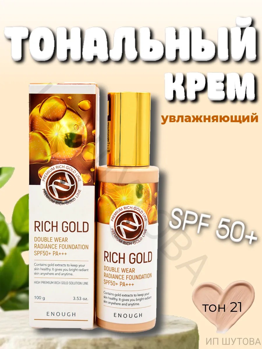 Увлажняющий матовый тональный крем для лица Rich Gold Double Wea Radiance Foundation Enough – оригинальная декоративная косметика из Кореи с уходовым эффектом. Маскирующее средство обеспечивает ровное покрытие с матирующим и корректирующим эффектом. Тональник выравнивает неровности, скрывая покраснения и прыщи. Косметика обеспечивает естественное сияние кожи лица. Благодаря оптимальному составу с коллагеном и SPF 50 (спф 50) крем обладает легким лифтинг – эффектом и омолаживает, защищая кожу от солнца.
