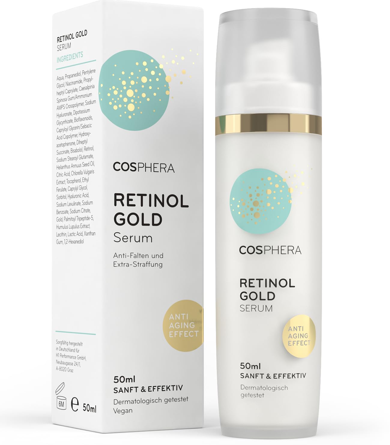 COSPHERA Retinol Gold Serum – gentle power against wrinkles and pigment spots. The highly effective anti-aging serum with innovative Golden A retinol complex combines effective skin rejuvenation with exceptional tolerability. It stimulates cell regeneration, refines pores and provides a visibly smoother, more even skin tone – without irritation. Golden A (retinol) uses colloidal gold as a carrier to transport retinol accurately and skin-friendly into deeper skin layers. In combination with hyaluronic acid and an anti-aging peptide, wrinkles are reduced and the skin is durably hydrated. Supplemented with RetinArt, a biotechnologically derived algae alternative to retinol, a perfectly tailored working complex is created with maximum effectiveness and minimal irritating potential. Seboclear MP and niacinamide regulate sebum production, refine the skin image and support the skin barrier - also ideal for impure or oily skin. Licorice extract and bisabolol have a calming effect and reduce redness. The soft milky texture hydrates intensively, without greg. Suitable for all skin types, including sensitive ones. Vegan, perfume-free and dermatologically tested. For visibly smoother, refined and radiantly beautiful skin – day after day. Use: Apply to cleansed skin in the morning and or evening, ideally in combination with the Cosphera Retinol Performance cream. GENERAL INFORMATION Helps reduce wrinkles, refine pores and visibly smooth and rejuvenate the skin. INGREDIENTS Aqua, propanediol, pentylene glycol, niacinamide, propyl eheptyl caprylate, caesalpinia spinosa gum Ammonium AMPS crosspolymer, sodium hyaluronate, dipotassium glycyrrhizate, bioflavonoids, capryloyl glycerin sebacid copolymer, hydroxyacetate ophenone, dihee ptyl succinate, bisabolol, retinol, sodium stearoyl glutamate, helianthus annus seed oil, citric acid, chlorella vulgaris extract, tocopherol, ethyl ferulate, caprylyl glycol, sorbitol, hyaluronic acid, sodium benzoate, sodium benzoate, sodium citrate, gold, palmitoyl tripe. eptide-5, Humulus Lupulus Extract, Lecithin, Lactic Acid, Xanthan Gum, 1,2-hexanediol INSTRUCTIONS FOR USE For best results, apply a small amount of serum to the face, neck and décolleté every day in the morning and evening after cleansing and massage gently. SAFETY WARNING For external use only. Avoid contact with the eyes. Use daily sun protection. See moreVegan and perfume-free: soft milky, perfume-free formula with hyaluronic acid, bisabolol and licorice extract. Vegan, dermatologically tested and made in Germany – for gentle, luxurious anti-aging care with a noticeable effect. Fine pores and fewer impurities – Seboclear MP and niacinamide regulate sebum production, clarify the skin image and refine pores, ideal for combination or oily skin types. Double effect with retinart: the combination of Golden A and RetinArt activates cell renewal, improves the skin structure and provides a visibly smoother, more radiant skin image, even with sensitive skin. Innovative gold technology: colloidal gold transports retinol stably and precisely into the skin. This way it unfolds its action deeply and gently at the same time, for maximum anti-aging effects and optimal tolerability. Gentle retinol: The Cosphera retinol Gold serum combines highly effective retinol with exceptional skin tolerability. Thanks to the innovative Golden A complex, it works effectively against wrinkles, without irritation or dryness.COSPHERA Retinol gezichtsserum, gezichtsverzorging met vitamine A, hyaluronzuur, niacinamide en zoethoutextract, 50 ml, anti-aging, anti-rimpelmoisturizer voor gezicht en hals, veganistisch, voor COSPHERA Retinol Gold Serum – zachte kracht tegen rimpels en pigmentvlekken. Het zeer effectieve anti-aging serum met innovatief Golden A retinol-complex combineert effectieve huidverjonging met buitengewone verdraagzaamheid. Het stimuleert de celregeneratie, verfijnt poriën en zorgt voor een zichtbaar gladder, gelijkmatiger huidbeeld – zonder irritatie. Golden A (retinol) gebruikt colloïdaal goud als drager om retinol nauwkeurig en huidvriendelijk in diepere huidlagen te transporteren. In combinatie met hyaluronzuur en een anti-aging peptide worden rimpels verminderd en de huid duurzaam gehydrateerd. Aangevuld met RetinArt, een biotechnologisch gewonnen algenalternatief voor retinol, ontstaat een perfect afgestemd werkcomplex met maximale effectiviteit en minimaal irriterend potentieel. Seboclear MP en niacinamide reguleren de talgproductie, verfijnen het huidbeeld en ondersteunen de huidbarrière – ook ideaal bij onzuivere of vettige huid. Zoethoutextract en bisabolol hebben een kalmerend effect en verminderen roodheid. De zachte melkachtige textuur hydrateert intensief, zonder te vetten. Geschikt voor alle huidtypes, ook gevoelige. Veganistisch, parfumvrij en dermatologisch getest. Voor zichtbaar gladdere, verfijnde en stralend mooie huid – dag na dag. Gebruik: 's ochtends en of 's avonds op de gereinigde huid aanbrengen, ideaal in combinatie met de Cosphera Retinol Performance crème. ALGEMENE INFORMATIE Helpt rimpels te verminderen, poriën te verfijnen en het huidbeeld zichtbaar glad te maken en te verjongen. INGREDIËNTEN Aqua, propanediol, pentyleenglycol, niacinamide, propyleheptyl caprylaat, caesalpinia spinosa gum Ammonium AMPS crosspolymeer, natriumhyaluronaat, dipotassium glycyrrhizate, bioflavonoïden, capryloyl glycerine sebacid copolymeer, hydroxyacetaat ophenone, dihee ptyl succinate, bisabolol, retinol, natriumstearoyl glutamaat, helianthus annus zaadolie, citrisch zuur, chlorella vulgaris extract, tocoferol, ethylferulate, caprylyl glycol, sorbitol, hyaluronzuur, natriumbenzoaat, natriumbenzoaat, natriumcitraat, goud, palmitoyl tripe. eptide-5, Humulus Lupulus Extract, Lecithine, Lactic Acid, Xanthaangom, 1,2-hexaandiol GEBRUIKSAANWIJZING Voor het beste resultaat dagelijks een kleine hoeveelheid serum 's ochtends en 's avonds na het reinigen op gezicht, hals en decolleté aanbrengen