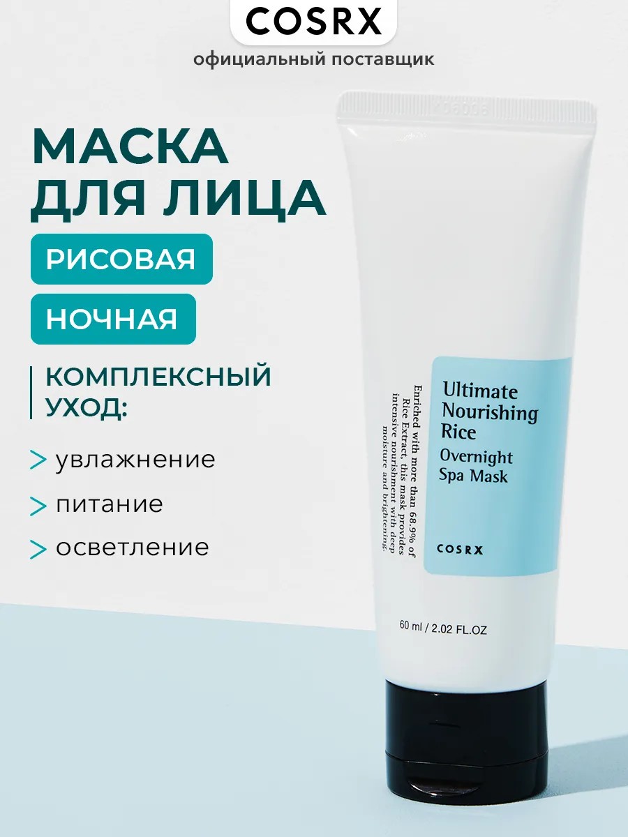 COSRX Ultimate Nourishing Rice Overnight Spa Mask provides: - intensive nourishment and softening of the skin; - elimination of flaking and tightness; - lightening of pigmentation; - evening out of complexion. Thanks to the high concentration of rice extract, the mask returns the skin to a velvety texture and gives a healthy glow. The product has a delicate texture and is quickly absorbed. Suitable for all skin types, but is especially recommended for normal, dry, and mature skin. How to use: 1. As a night mask. Apply the product 20-30 minutes before bedtime to previously cleansed and toned skin. Go to bed. In the morning, wash your face as usual. 2. As a wash-off mask. Apply the product to cleansed and toned skin of the face and neck. After 15 minutes, remove excess with a napkin or wash off with warm water. 3. As a nourishing cream. Apply the product to cleansed and toned skin and let it absorb.