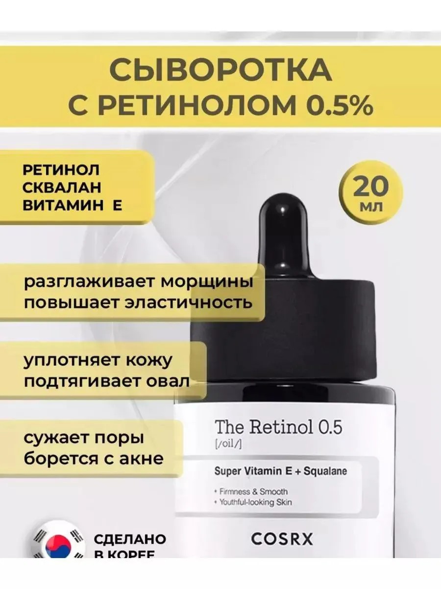 COSRX The Retinol 0.5 Oil — это омолаживающая сыворотка для лица, содержащее 0.5% ретинола, разработанное для борьбы с признаками старения, улучшения текстуры кожи и повышения её упругости. Это масло является интенсивным средством для антивозрастного ухода, которое помогает минимизировать морщины, тонкие линии и пигментацию, одновременно обеспечивая кожу необходимым увлажнением.
