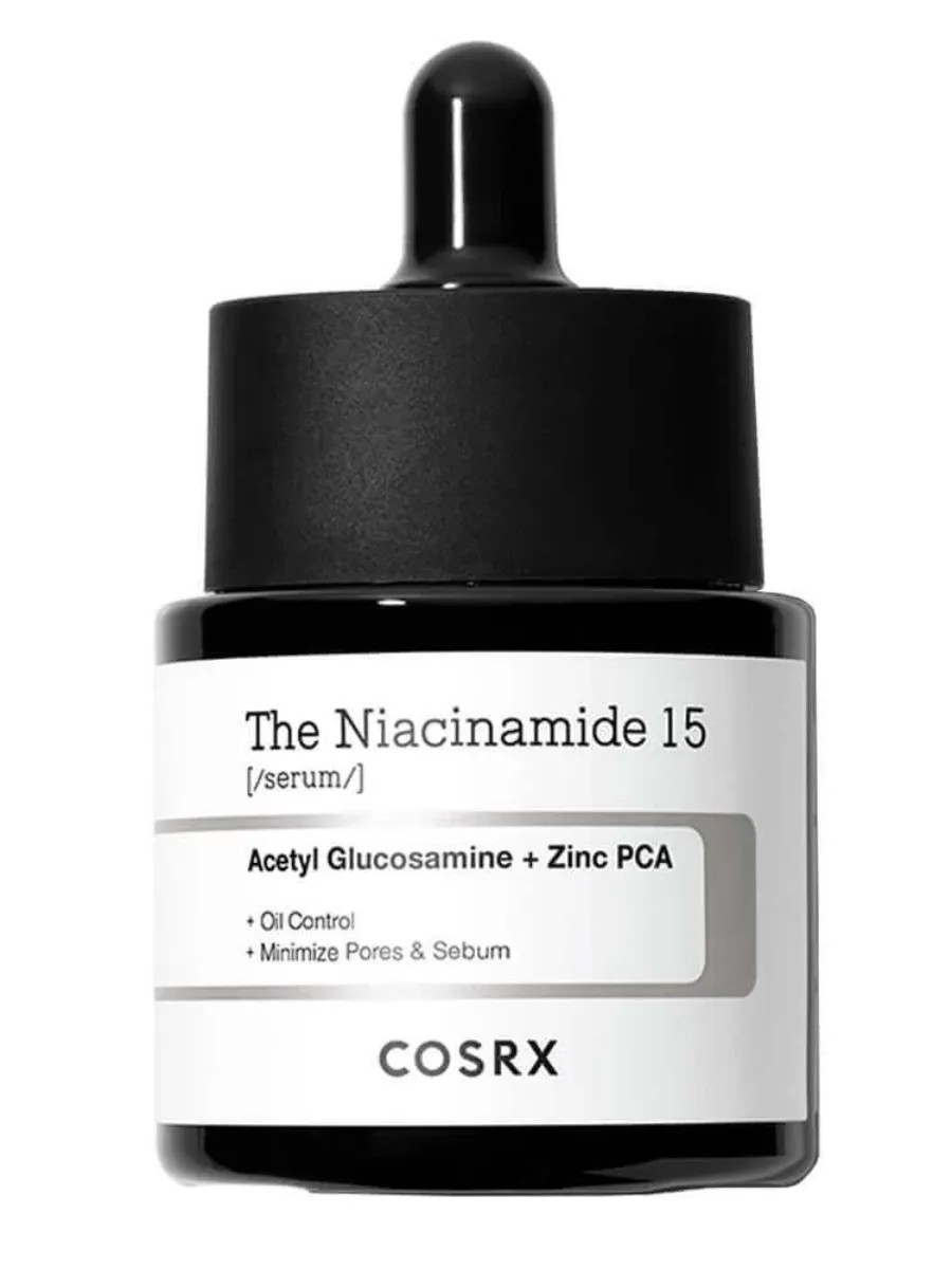 Сыворотка для лица The Niacinamide 15 Serum с Acetyl Glucosamine и Zinc PCA COSRX: — это высококонцентрированная сыворотка с 15 % ниацинамидом, дополненная ацетилглюкозамином (NAG) и Zinc PCA для комплексного ухода, особенно эффективного при акне. Формула лёгкая, быстро впитывается и не забивает поры.