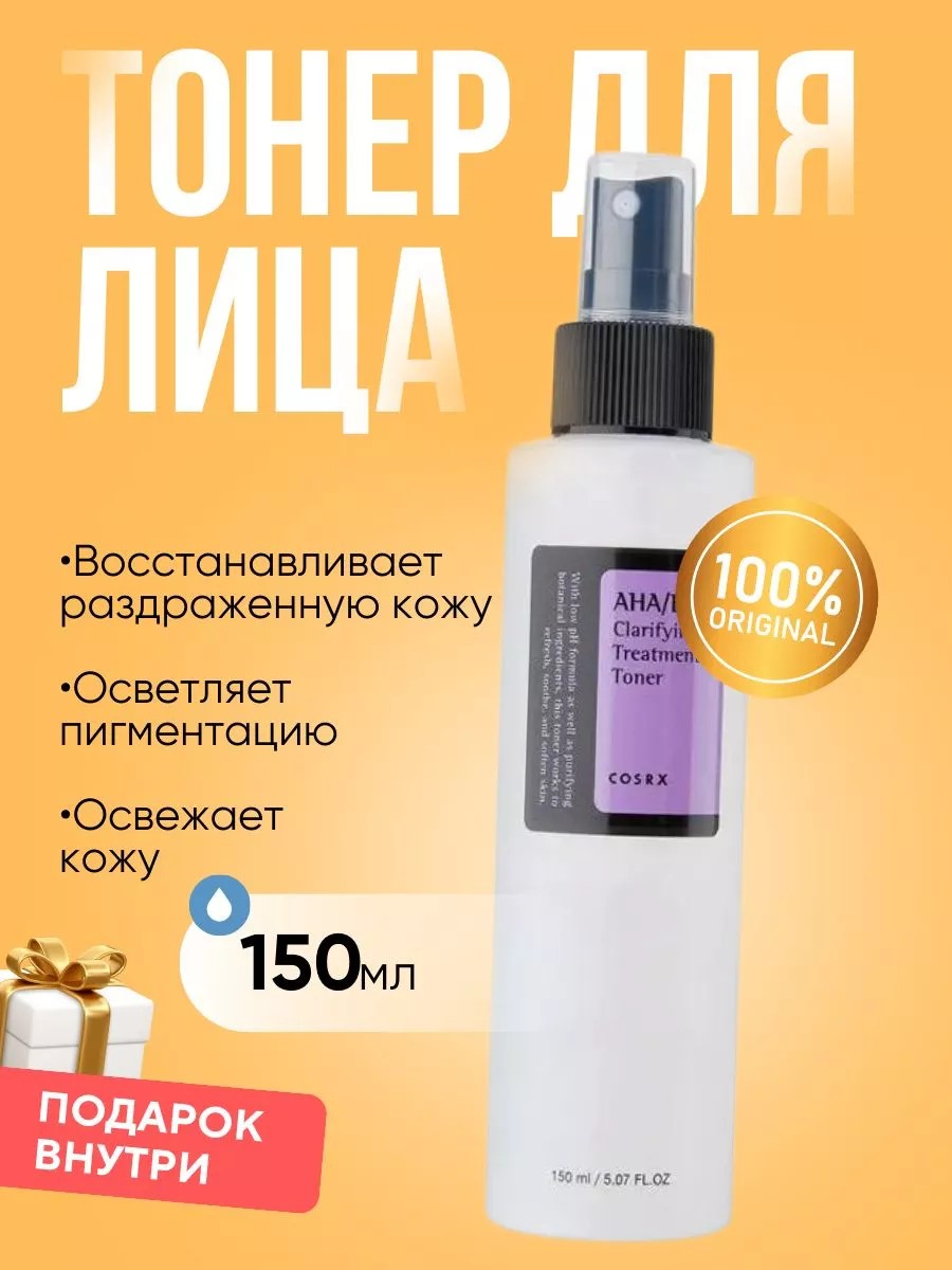 Тонер с кислотами для сужения пор COSRX AHA BHA CLARIFING TREATMENT TONER 150 ML Корея. COSRX AHA-BHA Clarifying Treatment Toner- мягкий очищающий тонер с кислотами и удобным дозатором в виде спрея. Корейский тонер для лица с кислотами решает такие задачи как: отшелушивание ороговевших клеток (десквамация), обновление кожи, тонизирование кожи, восстановление pH кожи после умывания, очищение пор, черные точки и прыщи, воспаления, антибактериальный эффект, противовоспалительный эффект, сужение пор, кислотный тонер, тонер с кислотами, салициловый тонер. Тоник для борьбы с несовершенствами Корея очень удобно использовать не только как ежедневный уход за кожей лица, но и для всего тела, где это необходимо, например, тонер в формате спрея очень удобно наносить на спину. Средство Коср икс кислотный тоник подходит для ухода за мужской кожей, подростковой кожей и универсален для любого пола и возраста. Тонер Cosrx упакован в коробку, и станет отличным подарком на день рождения и по любому поводу. Средство подойдет также как: подарок для подруги, подарок коллеге, подарок девушке, подарок сестре, подарки взрослым, подарки женщинам, подарок для мамы, подарок женщине, подарок жене, подарок любимой, подарки для женщин, подарок для любимой, подарки подругам, подарки для сестры, недорогие подарки.