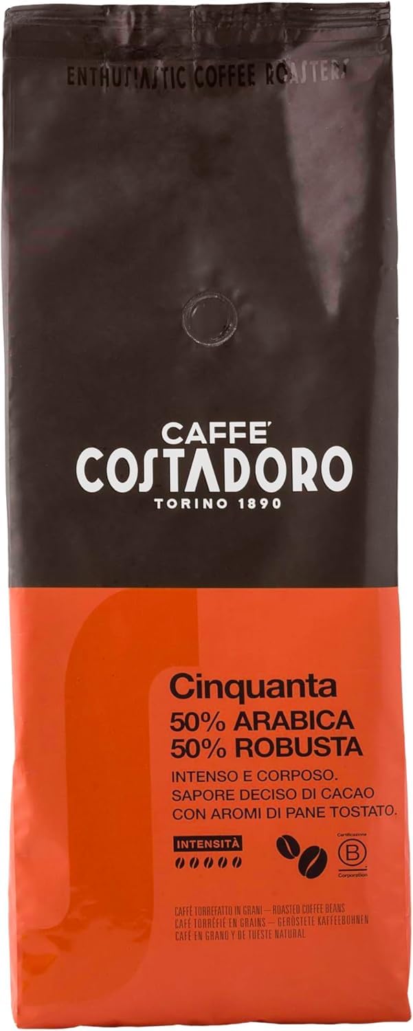 Costadoro Cinquanta Whole Bean Coffee: the new blend composed of 50 Arabica and 50 high-quality Robusta varieties. This combination offers a pronounced taste, with intense notes of cocoa and aromas of toast that blend perfectly in a rich and full-bodied cup. Coffee Ingredients P.when('A').execute(function(A) { A.on('a:expander:toggle_description:toggle:collapse', function(data) { window.scroll(0, data.expander. expander[0].offsetTop-100) }) }) Safety Warning May contain caffeine. Handle with care to avoid injury. See moreRich and structured espresso – The balance between the two coffee varieties gives this blend a full body and aromatic strength, making it ideal for those who enjoy a robust and well-rounded coffee. Pronounced and enveloping flavor – Costadoro Cinquanta is a balanced 50 50 blend of selected Arabica and Robusta varieties, crafted to offer a rich and lingering aromatic profile. The beans develop notes of cocoa and toast, providing an intense and satisfying taste experience. Costadoro Cinquanta Whole Bean Coffee 1 kg – The new whole bean blend from Costadoro, designed for those who want to grind their coffee fresh every day and obtain an espresso with a bold character, just like at a coffee shop. The 1 kg format ensures an ideal supply for regular consumption, while preserving the aroma and intensity.Description du produit Café en grains Costadoro Cinquanta : le nouveau mélange composé à 50 de variétés Arabica et à 50 de variétés Robusta de grande qualité. Cette combinaison offre un goût prononcé, avec des notes intenses de cacao et des arômes de pain grillé qui se marient parfaitement dans une tasse riche et enveloppante. Ingrédients café P.when('A').execute(function(A) { A.on('a:expander:toggle_description:toggle:collapse', function(data) { window.scroll(0, data.expander. expander[0].offsetTop-100) }) }) Avertissement De Sûreté Peut contenir de la caféine. Manipuler avec soin pour éviter les blessures. Voir plusEspresso riche et structuré – L'équilibre entre les deux variétés de café confère à ce mélange un corps plein et une force aromatique qui le rend idéal pour ceux qui aiment un café énergique et rond. Goût prononcé et enveloppant – Costadoro Cinquanta est un mélange équilibré à 50 entre des variétés Arabica et Robusta sélectionnées, étudié pour offrir un profil aromatique riche et persistant. Les grains développent des notes de cacao et de pain grillé, offrant une expérience gustative intense et satisfaisante. Costadoro Cinquanta Caffè en grains 1 kg – Le nouveau mélange en grains signé Costadoro, conçu pour ceux qui souhaitent moudre leur café frais chaque jour et obtenir un espresso au caractère affirmé, comme au bar. Le format 1 kg garantit un approvisionnement idéal pour une consommation régulière, tout en conservant intacts l'arôme et l'intensité.Costadoro Cinquanta 1 kg en grains - Mélange de café en grains