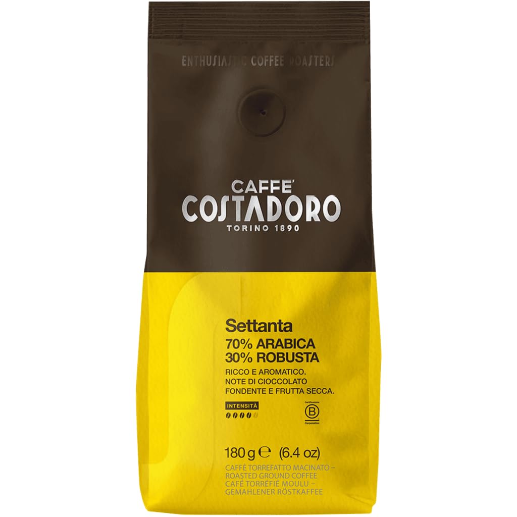 : The Costadoro coffee supply chain is controlled from the very beginning, with carefully selected samples sourced from the world's finest plantations. The manufacturing process is 100 Made in Italy. Each coffee is inspected, roasted, and evaluated by a qualified team to verify its organoleptic qualities only the very best pass this rigorous selection process, after which the purchg process begins. Behind every cup of Costadoro coffee lies a story: the selection of each bean, the expertise, the dedication at every stage of production, the experience, the research, the innovation, the enthusiasm, and the passion. Above all, choose whether you want to make a coffee or a Costadoro! Costadoro Settanta ground coffee for moka pots is the new ground coffee blend for home use, ideal for moka pot brewing. This new Costadoro blend is composed of 70 Arabica and 30 high-quality Robusta varieties, giving it a rich and aromatic flavor with notes of dark chocolate and dried fruit. Ingredients: coffee. P.when('A').execute(function(A) { A.on('a:expander:toggle_description:toggle:collapse', function(data) { window.scroll(0, data.expander. expander[0].offsetTop-100) }) }) Safety Warning: Contains caffeine. Not suitable for children, pregnant women, or people particularly sensitive to caffeine. store in a cool, dry place away from direct sunlight. See more[SURASCALITY AND RESPONSIBILITY GUARANTEED BY B CORP CERTIFICATION] Costadoro has been a certified B Corp since 2023 and is part of a global movement of companies that adhere to high standards of social and environmental impact. [VALUE-SAVE 180G PACKS] Costadoro cento coffee is available in convenient 180g bags, perfect for maintaining freshness and preserving aroma. The compact size is ideal for everyday use and ensures a consistently fragrant product. A practical solution for those who use a moka pot daily and want consistent quality. [EXCELLENT ROASTING MADE IN ITALY] Roasting, carried out in Italy, is calibrated at optimal times and temperatures to enhance the characteristics of each variety. This key step results in an aromatic, elegant, and balanced product. Italian expertise in coffee processing gives the Costadoro Quando blend a superior level of refinement. [ADVANCED BEAN SELECTION] Every Costadoro bean is scanned using an advanced optical sorter: a technology that identifies and rejects defective beans based on color, shape, and size. This process ensures extremely precise selection, guaranteeing only intact, high-quality beans. The result is a clean, consistent, and superior coffee in every cup. [RICH AND AROMATIC TASTE: PRECIOUS 70 ARABICA – 30 ROBUSTA BLEND] Costadoro Settanta combines 70 Arabica and 30 Pregiata Robusta, creating a blend with a rich and enveloping flavor profile. Notes of dark chocolate and dried fruit add intensity and depth, making each cup satisfying and full of character. Perfect for those who enjoy a strong aroma without sacrificing balance.Description du produit La filière du café Costadoro est contrôlée dès le début, en sélectionnant avec soin les échantillons provenant des meilleures plantations du monde. Le processus de fabrication est 100 Made in Italy. Chaque café est contrôlé, torréfié et évalué par une équipe qualifiée afin d'en vérifier les qualités organoleptiques seuls les meilleurs passent toutefois la sélection rigoureuse, après quoi le processus d'achat est lancé. Derrière chaque tasse de café Costadoro se cache une histoire : la sélection de chaque grain, le savoir-faire, le dévouement à chaque étape de la production, l'expérience, la recherche, l'innovation, l'enthousiasme et la passion. Avant tout, choisissez si vous voulez faire un café ou si vous voulez faire un Costadoro ! Le café moulu pour moka Costadoro Settanta est le nouveau mélange de café moulu pour la maison, idéal pour les extractions avec la moka. Ce nouveau mélange Costadoro est composé de 70 de variétés Arabica et de 30 de variétés Robusta de grande qualité qui lui confèrent une saveur riche et aromatique avec des notes de chocolat noir et de fruits secs. Ingrédients café P.when('A').execute(function(A) { A.on('a:expander:toggle_description:toggle:collapse', function(data) { window.scroll(0, data.expander. expander[0].offsetTop-100) }) }) Avertissement De Sûreté Contient de la caféine. Ne convient pas aux enfants, aux femmes enceintes ou aux personnes particulièrement sensibles à la caféine. Conserver dans un endroit frais et sec, à l'abri de la lumière directe Voir plus[DURABILITÉ ET RESPONSABILITÉ GARANTIES PAR LA CERTIFICATION B CORP] Costadoro est certifié B Corp depuis 2023 et fait partie d'un mouvement mondial d'entreprises qui respectent des normes élevées d'impact social et environnemental. [PAQUETS ÉCONOMIQUES DE FRAÎCHEUR 180G] Le café Costadoro cento est disponible dans des sachets pratiques de 180 g, parfaits pour conserver la fraîcheur et préserver les arômes. Le format compact est idéal pour un usage quotidien et garantit un produit toujours parfumé. Une solution pratique pour ceux qui utilisent la moka au quotidien et souhaitent une qualité constante. [EXCELLENTE TORRÉFACTION FABRIQUÉE EN ITALIE] La torréfaction, réalisée en Italie, est calibrée à des moments et des températures optimaux pour valoriser les caractéristiques de chaque variété. Cette étape clé permet d'obtenir un produit aromatique, élégant et équilibré. L'expérience italienne dans la transformation du café confère au mélange Costadoro Quando un niveau de finesse supérieur. [SÉLECTION AVANCÉE DES GRAINS] Chaque grain de Costadoro est numérisé à l'aide du trieur optique avancé : une technologie qui identifie et rejette les grains présentant des défauts en fonction de la couleur, de la forme et de la taille. Le processus garantit une sélection extrêmement précise, garantissant uniquement des grains intacts et de qualité. Le résultat est un café propre, homogène