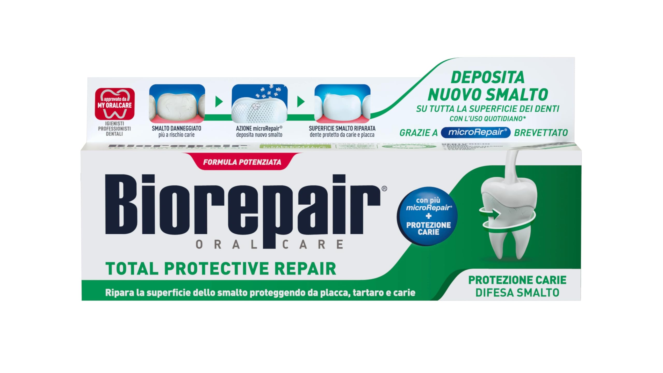 What distinguishes Biorepair Total Protective Repair from other toothpastes: nail polish and dentin cannot regenerate themselves. Therefore, any deterioration is biologically irreversible. Biorepair is the first microRepair toothpaste that can penetrate microrepair micro-residues of enamel and dentin by chemically binding them and repairing micro-abrasions. INSTRUCTIONS FOR USE Brush your teeth twice a day for effective mouth cleaning and lasting protection against plaque, tartar and caries, so your breath stays fresh. SAFETY WARNING Keep out of the reach of children under 6 years of age. Use only under adult supervision. Do not swallow. In case of accidental ingestion, consult a doctor. Avoid contact with the eyes. See moreFluoride-free and suitable for children under 6 years without adult supervision. In addition, they release zinc with known antibacterial properties. Biorepair This is the first toothpaste based on microRepair, biomimetic particles that can penetrate micro-residues of enamel and dentin. MicroRepair are biomimetic molecules of hydroxyapatite, the same substances as the natural enamel of our teeth, which spontaneously bind to their surface, making it homogeneous, strong and durable. Repairs the enamel surface and at the same time protects against plaque, tartar and tooth decay.Biorepair Total Protective Repair Tandpasta, 12 verpakkingen van 75 ml, herstelt nagellak, beschermt tegen coating, tandsteen en cariës, repareert nagellak, houdt Wat onderscheidt Biorepair Total Protective Repair van andere tandpasta's: nagellak en dentine kunnen niet zelf regenereren. Daarom is elke verslechtering biologisch onomkeerbaar. Biorepair is de eerste microRepair tandpasta die in microrepair microrestjes van glazuur en dentine kan doordringen door deze chemisch te binden en microschaafwonden te repareren. GEBRUIKSAANWIJZING Borstel je tanden twee keer per dag voor een effectieve mondreiniging en duurzame bescherming tegen tandplak, tandsteen en cariës, zodat je adem fris blijft. VEILIGHEIDSWAARSCHUWING Buiten het bereik van kinderen jonger dan 6 jaar bewaren. Alleen gebruiken onder toezicht van volwassenen. Niet inslikken. Bij accidentele inslikken een arts raadplegen. Vermijd contact met de ogen. Meer bekijkenFluoridevrij en geschikt voor kinderen jonger dan 6 jaar zonder toezicht van volwassenen. Bovendien geven ze zink vrij met bekende antibacteriële eigenschappen. Biorepair Dit is de eerste tandpasta op basis van microRepair, biomimetische deeltjes die in microrestjes van glazuur en dentine kunnen doordringen. MicroRepair zijn biomimetische moleculen van hydroxyapatiet, dezelfde stoffen als het natuurlijke email van onze tanden, waardoor ze zich spontaan aan hun oppervlak binden, waardoor het homogeen, sterk en duurzaam wordt. Repareert het emailoppervlak en beschermt tegelijkertijd tegen tandplak, tandsteen en tandbederf.