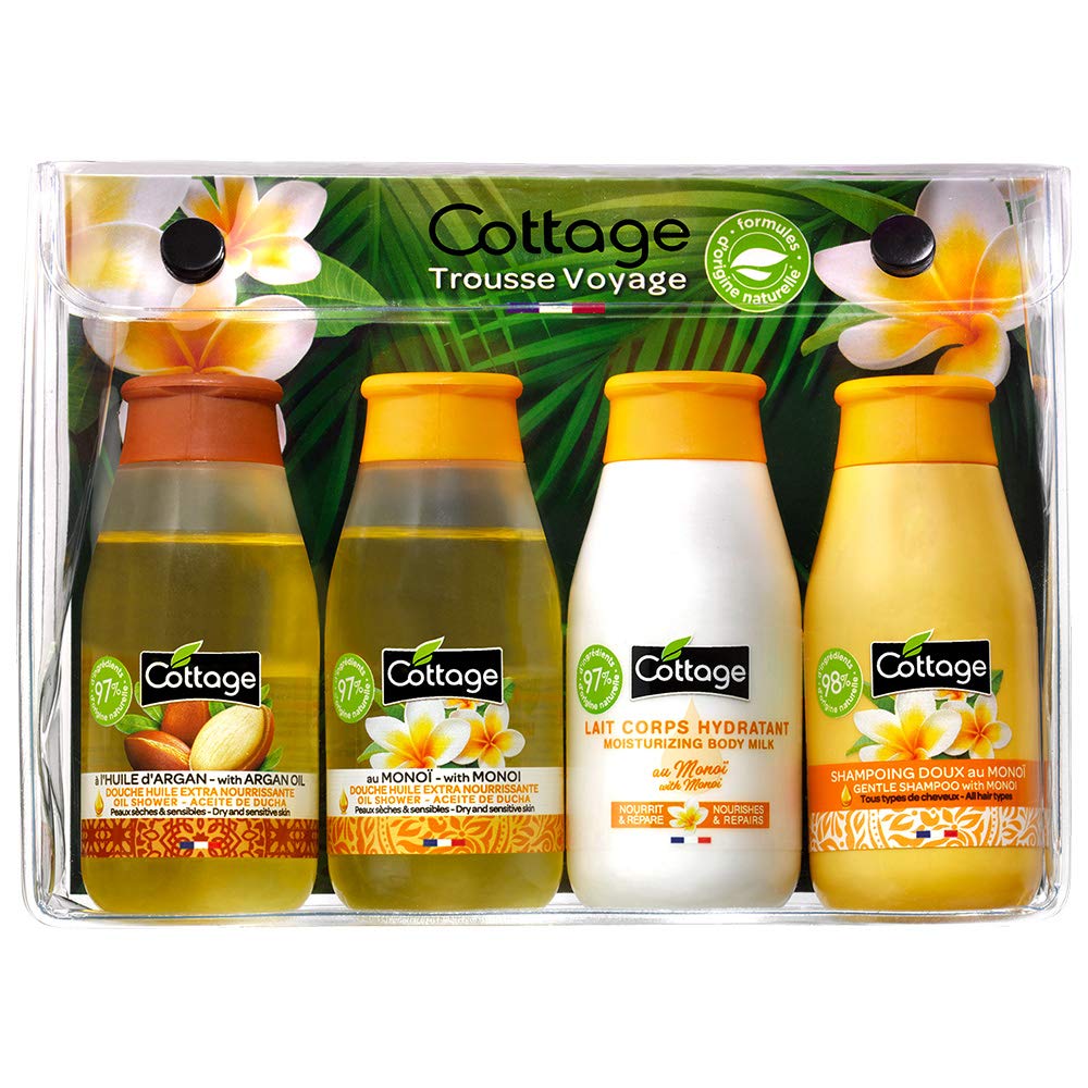 Cottage Trousse de Voyage Monoï 2 Douches Huile Lait Corps Hydratant Shampoing Doux 50 ml 4 Unités