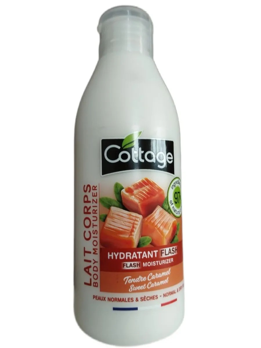 COTTAGE Sweet Caramel Body Moisturizer - Normal & Dry Skin, 200 ml. This moisturizing body milk with a sweet caramel scent is specially designed for normal to dry skin. Its light texture is quickly absorbed without leaving a greasy film, providing instant hydration and a seductive caramel scent with notes of milk and vanilla. Clinically tested, it delivers 96% more skin hydration one hour after application. Dermatologist-approved. Contains 97% natural ingredients.