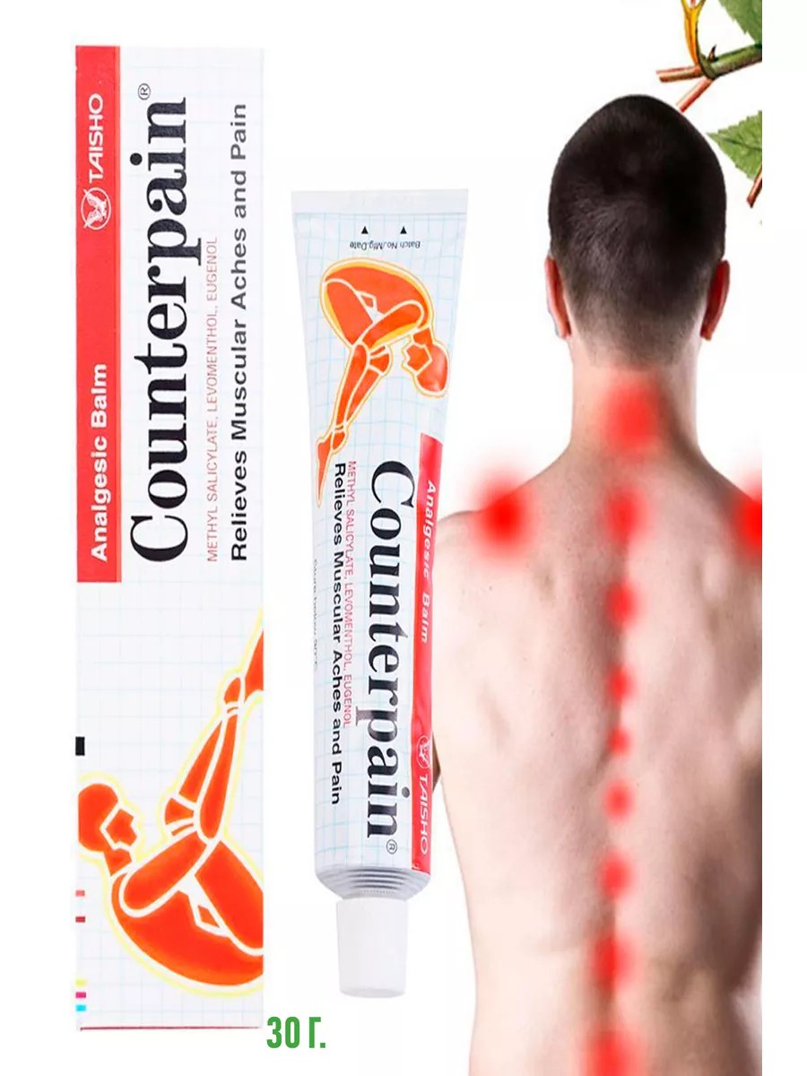 Обезболивающая и противовоспалительная мазь "Counterpain" (Каунтер пэйн) является чрезвычайно популярным средством для снятия мышечной и суставной боли. Быстро и эффективно снимет мышечные, суставные и ревматические боли, а также боли при растяжениях и ушибах. Данная мазь широко используется в спорте при травмах, отёках, болях в суставах и мышцах - она выгоняет молочную кислоту из мышц. Является отличным домашним средством для лечения сильной боли в мышцах, сухожилиях и суставах. Мазь не оставляет следов на одежде.Мазь "Counterpain" содержит ментол, евгенол (гвоздичное масло) и метилсалицилат, благодаря которым данное средство обладает сильным и продолжительным разогревающим, противовоспалительным и отвлекающим боль эффектом.Мазь "Counterpain" в красной упаковке обладает сильно выраженным разогревающим эффектом. Мазь завоевала популярность в Японии. В Таиланде и других странах Азии особенно широко известна среди бойцов муай тая – тайского бокса.Активные ингредиенты:Метилсалицилат (противовоспалительное ср-во) - 10,2%Евгенол (анальгетик) - 1,36%Левоментол (местнораздражающее ср-во) - 5,44%.Хранить при температуре не выше 30 С.Применение: нанесите небольшое количество мази массажными движениями на тело, мышцы и суставы. Не применять на открытые раны, избегать попадания на слизистые оболочки.