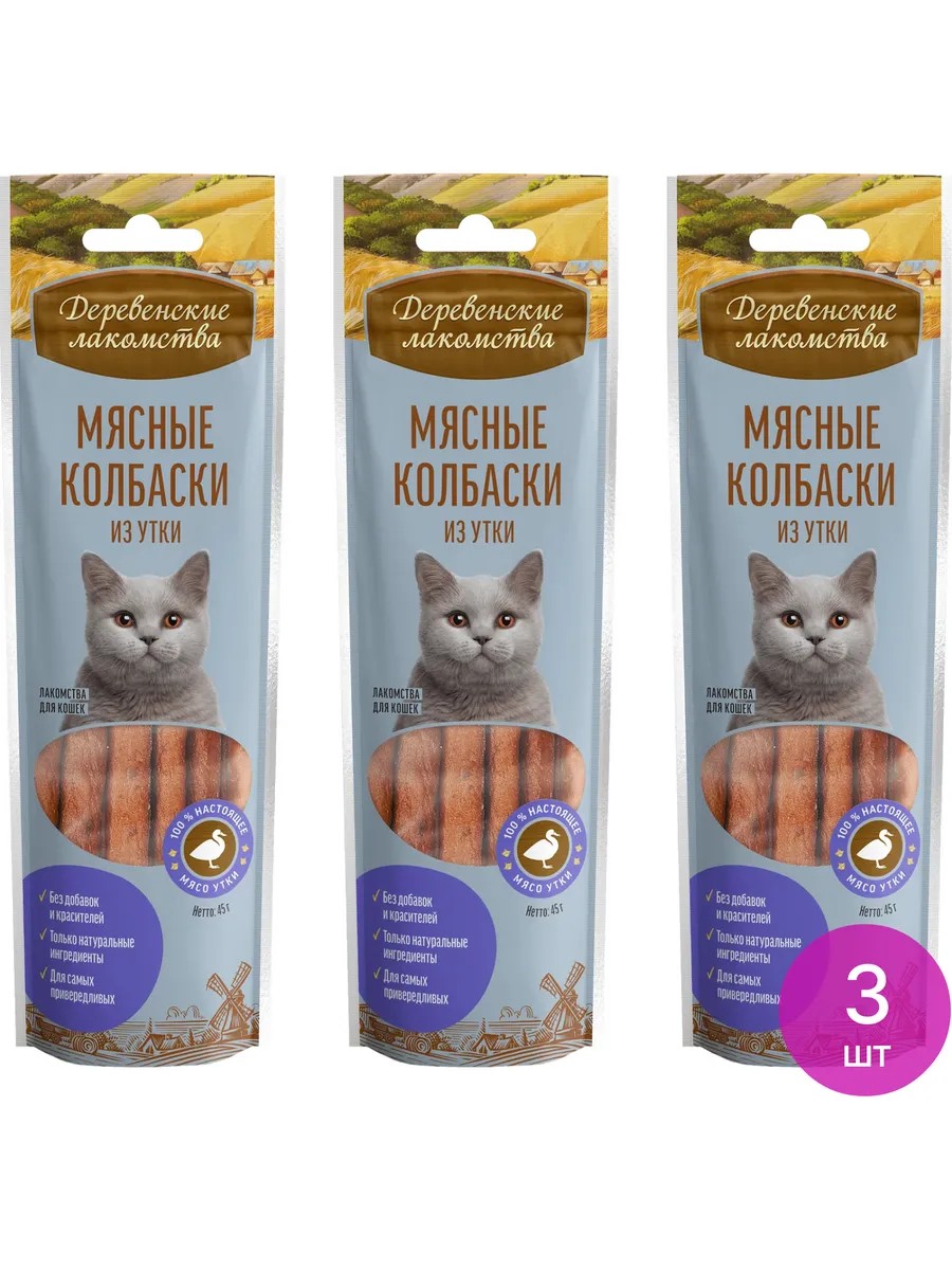 Деревенские лакомства Лакомство для взрослых кошек колбаски из утки, 45г, 3 шт