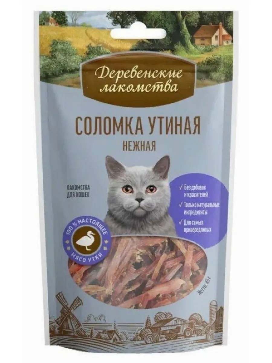 Лакомство для кошек Деревенские лакомства Соломка утиная нежная, палочки с мясом 45г / сухой корм. Лакомство для взрослых кошек Деревенские лакомства Соломка утиная нежная - вкусный и полезный продукт для четвероногих членов семьи. Кошки с удовольствием поглощают его и готовы ради него обучиться сложным командам и стать самым послушным питомцем для своего хозяина. Оно приведет в восторг даже самого привередливого питомца. Нашу нежную утиную соломку можно использовать как отдельное лакомство, а можно добавлять в основной корм. Попробуйте - от такого корма не откажется никто! Продукт отвечает всем требованиям безопасности для здоровья животных и содержит только разрешенные контролем качества ингредиенты: мясо утки. Сухое лакомство не приведет к избыточному весу. Соломка для кошек одинаково подходят для активных и для выздоравливающих после болезни питомцев. Хотите, чтобы ваш пушистый друг питался только вкусной пищей и получал от этого настоящее удовольствие? Купите сытное, полезное лакомство Деревенские лакомства Соломка утиная нежная! Деревенские лакомства для кошек / еда для кошек / зоотовары для кошек / питание для кошек / корм для кошек лакомство.