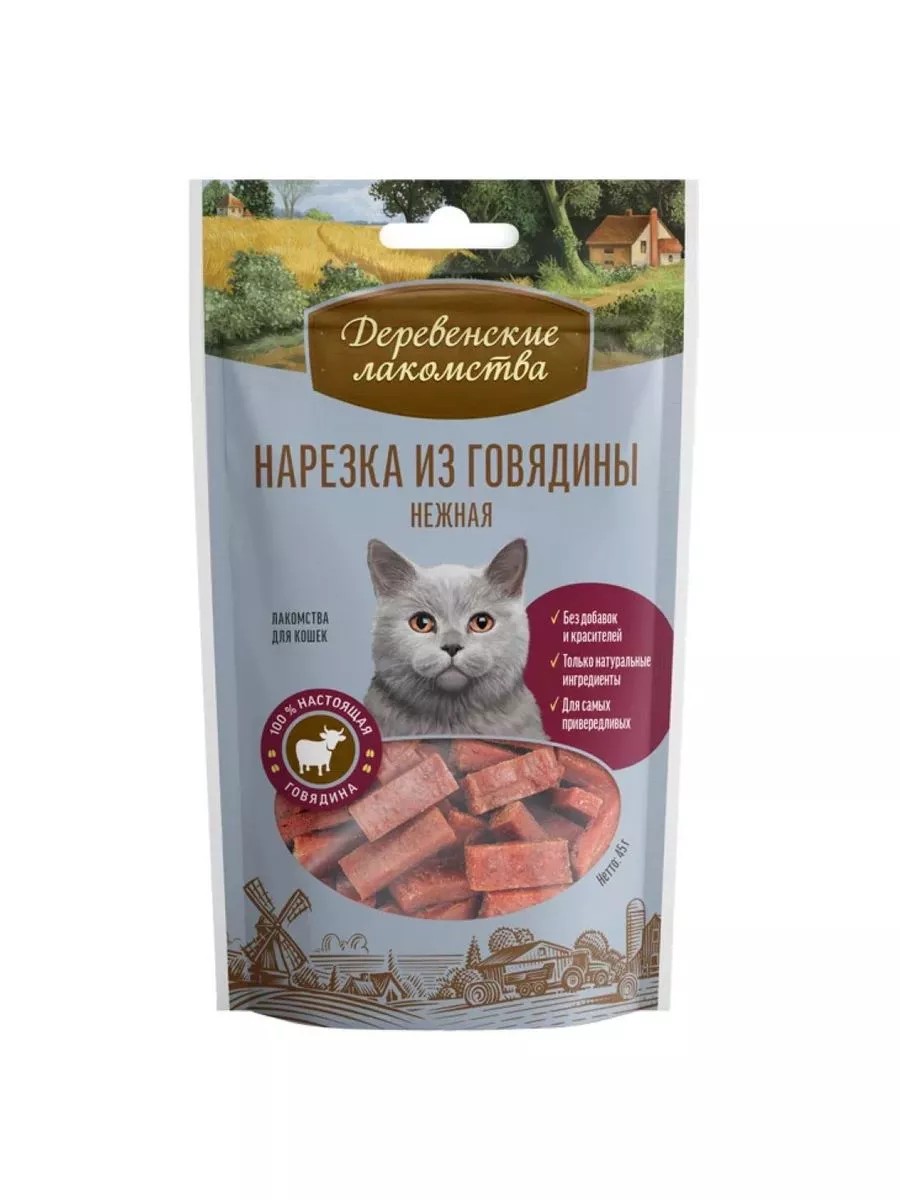 Деревенские лакомства, Лакомство для кошек Нарезка из говядины нежная, 45 г, 1 уп. Свежайшее мясо говядины, которое мы используем в наших лакомствах — превосходное угощение для любимой кошки. Натуральное мясо говядины. Без добавок и красителей. Вкусно и полезно. Для самых привередливых. "Деревенские лакомства" созданы специально для приверед. Ни одна кошка не сможет устоять перед этими сочными, нежными кусочками отборной говядины. Идеального размера дольки, изготовленные без использования красителей, консервантов и специй, полностью сохранили свой природный вкус. "Деревенские лакомства" станут любимым угощением для Вашей кошки.