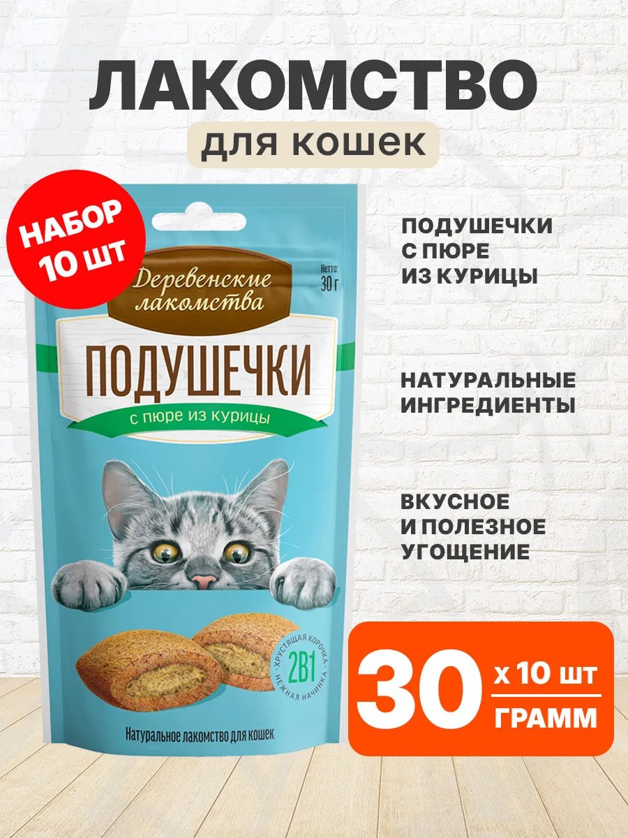 | Комплектация | лакомство для кошек подушечки с пюре из курицы 30 гр 10 шт |